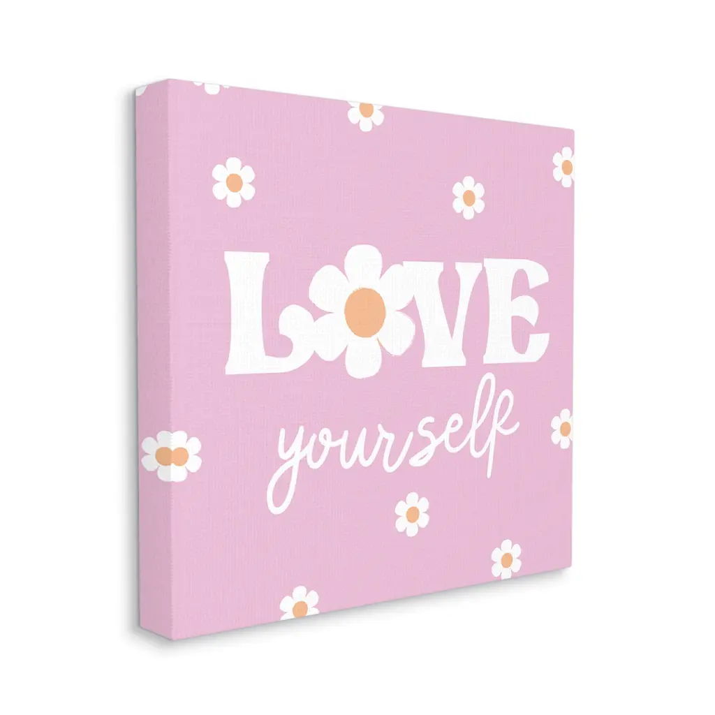 We create our stretched canvas to the highest standards. Using only the highest quality inks and canvas on Mimaki printers, we hand-cut and stretch each piece over a 1.5-inch thick wooden frame for hanging. As a result, the art comes ready to hang on the sturdy ledge with no installation required. Stupell Wall Art is made in the USA.Features: Dimensions: 17 x 1.5 x 17 InchesStretched Canvas Sizes Include Standard: 17 x 1.5 x 17 Large: 24 x 1.5 x 24 X-Large: 30 x 1.5 x 30 Oversized: 36 x 1.5 x 36Wall Art is Ready to Hang - No Installation or Hardware Needed. For Easy Set Up Lean or Layer Artwork on Shelf or Against Wall.Our stretched canvas is created with the highest standards. We use only the highest quality inks and canvas on our in house Mimaki printers, and then hand cut and stretch each piece over a 1.5 inch thick wooden frame for hanging. Made In USA.Artwork Relates To: Inspirational, Motivational, Phrase, Pink, Daisies, Flower, Love YourselfDesign by Lula Bijoux & co.