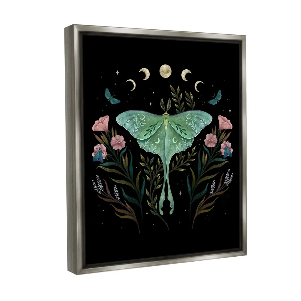 Elevate your home or office to the next level with Stupell Framed Floating Canvas Wall Art. Our premium hand-stretched canvas is mounted securely into a sturdy lightweight frame. The museum-style gap between the wrapped canvas and the box frame gives the illusion of floating artwork. Stupell Wall Art is made in the USA.Features: Dimensions: 17 x 1.7 x 21 Frame, 16 x 1.5 x 20 Canvas ArtFloating Frame Canvas Products are available in sizes 17"x21" and 25"x31". All Floating Frame Canvas Products have a 1.7" Depth.Wall Art is Ready to Hang with Hardware Free Hanging. No Installation required. For Easy Set Up Lean or Layer Artwork on Shelf or Against Wall. Artwork is Permently Fixed into the Frame.Our elevated 1.7" Thick Floating Frame is the perfect complement to our canvas style Wall Art. We use only the highest quality inks in house with industry leading printing solutions. Canvas is hand stretched over a durable wood foundation and then mounted securly into a Modern Box Frame. Made in the USA.Artwork Relates To: Plant, Animal, Butterfly, Insect, Invertebrate, Astronomy, Moon, Nature, Night, Moth, Pattern, Astral, Celestial, Flower, FloralDesign by Episodic Drawings