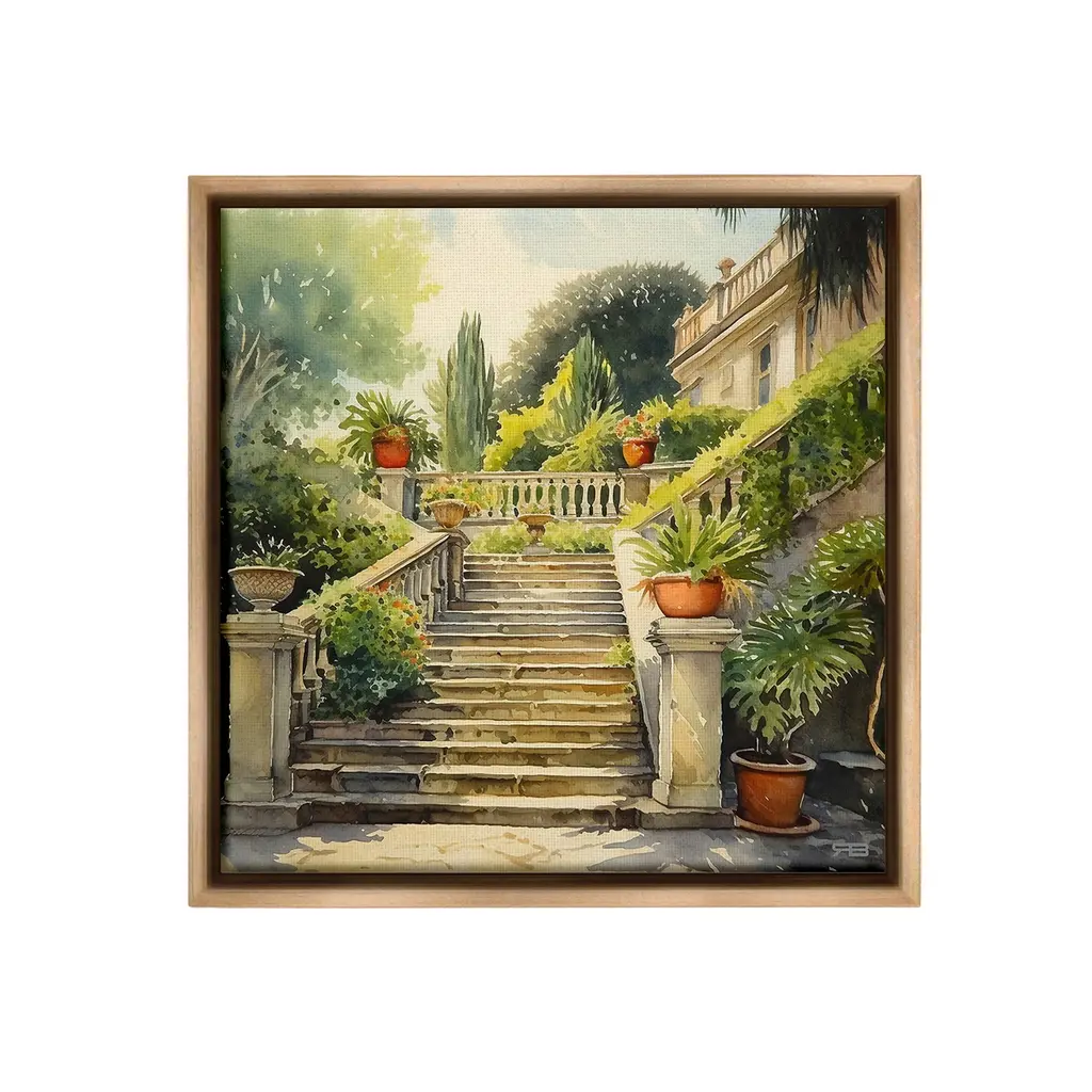 Elevate your home or office to the next level with Stupell Framed Floating Canvas Wall Art. Our premium hand-stretched canvas is mounted securely into a sturdy lightweight frame. The museum-style gap between the wrapped canvas and the box frame gives the illusion of floating artwork. Stupell Wall Art is made in the USA.Features: Dimensions: 18 x 1.7 x 18 Frame, 17 x 1.5 x 17 Canvas ArtFloating Frame Canvas Products are available in sizes 18"x18" and 25"x25". All Floating Frame Canvas Products have a 1.7" Depth.Wall Art is Ready to Hang with Hardware Free Hanging. No Installation required. For Easy Set Up Lean or Layer Artwork on Shelf or Against Wall. Artwork is Permently Fixed into the Frame.Our elevated 1.7" Thick Floating Frame is the perfect complement to our canvas style Wall Art. We use only the highest quality inks in house with industry leading printing solutions. Canvas is hand stretched over a durable wood foundation and then mounted securly into a Modern Box Frame. Made in the USA.Artwork Relates To: Architecture, Building, House, Villa, Staircase, Plant, Potted Plant, Hacienda, Garden, Nature, City, Road, Street, Flower, Cottage, Town, EuropeanDesign by RB