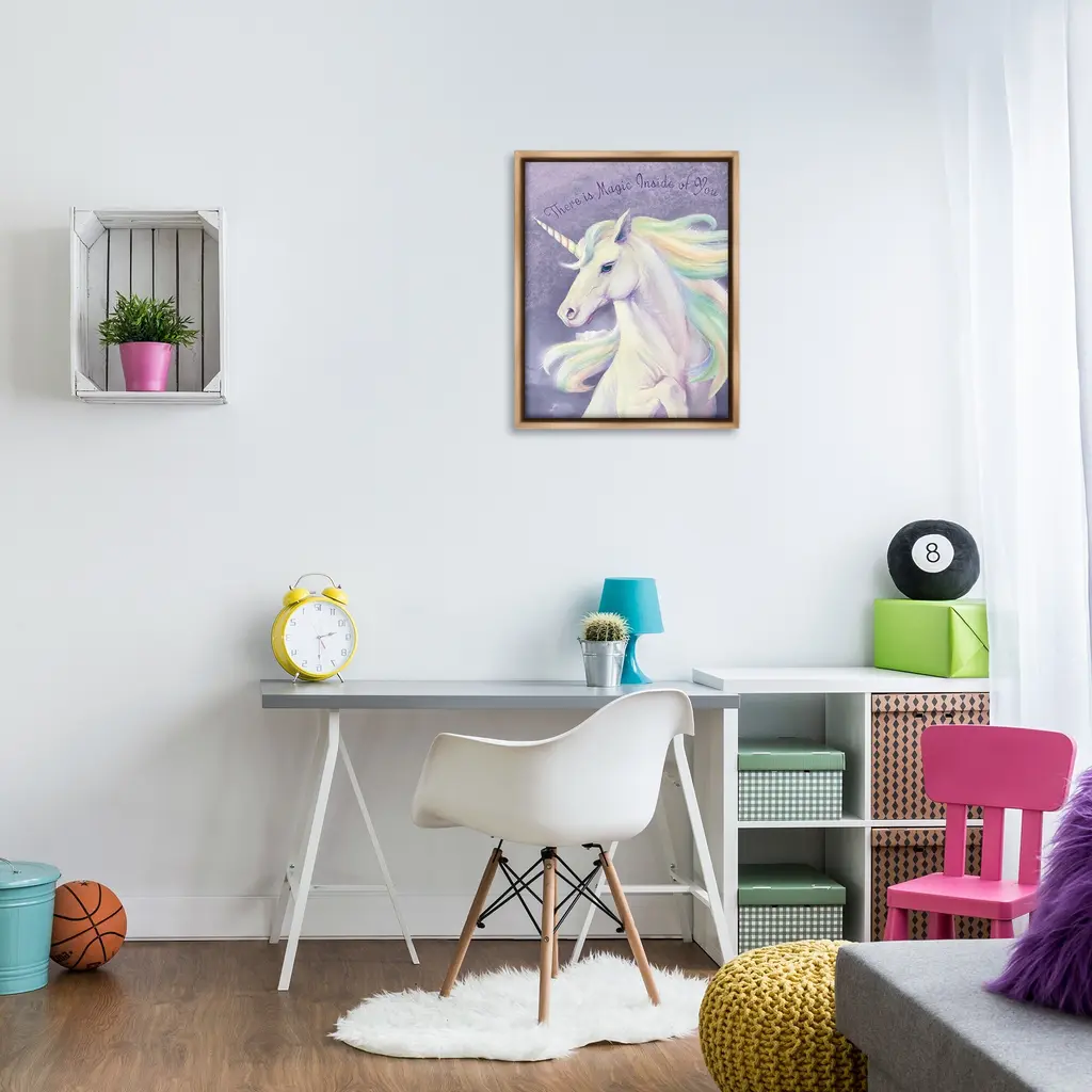 Elevate your home or office to the next level with Stupell Framed Floating Canvas Wall Art. Our premium hand-stretched canvas is mounted securely into a sturdy lightweight frame. The museum-style gap between the wrapped canvas and the box frame gives the illusion of floating artwork. Stupell Wall Art is made in the USA.Features: Dimensions: 17 x 1.7 x 21 Frame, 16 x 1.5 x 20 Canvas ArtFloating Frame Canvas Products are available in sizes 17"x21" and 25"x31". All Floating Frame Canvas Products have a 1.7" Depth.Wall Art is Ready to Hang with Hardware Free Hanging. No Installation required. For Easy Set Up Lean or Layer Artwork on Shelf or Against Wall. Artwork is Permently Fixed into the Frame.Our elevated 1.7" Thick Floating Frame is the perfect complement to our canvas style Wall Art. We use only the highest quality inks in house with industry leading printing solutions. Canvas is hand stretched over a durable wood foundation and then mounted securly into a Modern Box Frame. Made in the USA.Artwork Relates To: Fantasy, Unicorn, Horse, AnimalDesign by Ziwei Li
