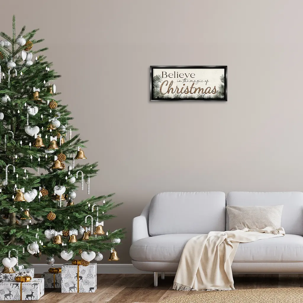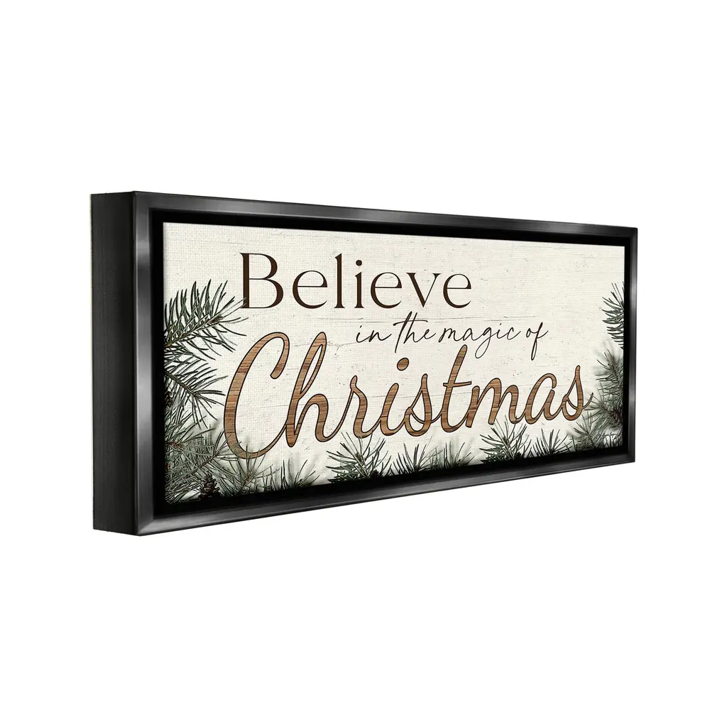 Elevate your home or office to the next level with Stupell Framed Floating Canvas Wall Art. Our premium hand-stretched canvas is mounted securely into a sturdy lightweight frame. The museum-style gap between the wrapped canvas and the box frame gives the illusion of floating artwork. Stupell Wall Art is made in the USA.Features: Dimensions: 25 x 1.7 x 11 Frame, 24 x 1.5 x 10 Canvas ArtFloating Frame Canvas Products are available in sizes 25"x11" and 31"x14". All Floating Frame Canvas Products have a 1.7" Depth.Wall Art is Ready to Hang with Hardware Free Hanging. No Installation required. For Easy Set Up Lean or Layer Artwork on Shelf or Against Wall. Artwork is Permently Fixed into the Frame.Our elevated 1.7" Thick Floating Frame is the perfect complement to our canvas style Wall Art. We use only the highest quality inks in house with industry leading printing solutions. Canvas is hand stretched over a durable wood foundation and then mounted securly into a Modern Box Frame. Made in the USA.Artwork Relates To: Winter, Seasonal, Holiday, Christmas, Tree, Fir, Rustic, Country, Cabin, Believe in the Magic of ChristmasDesign by Susie Boyer