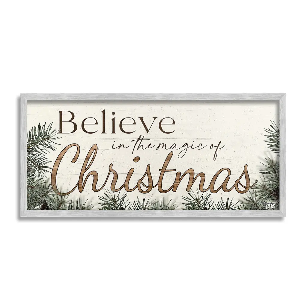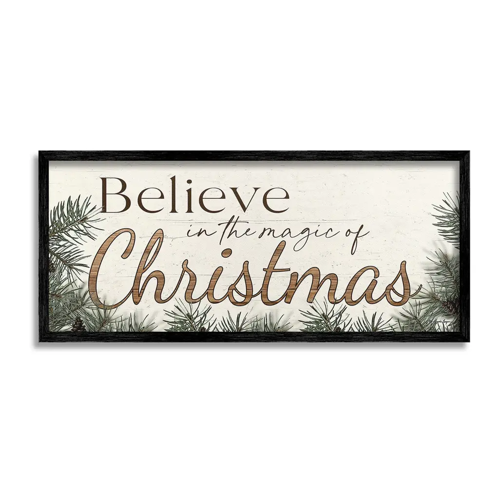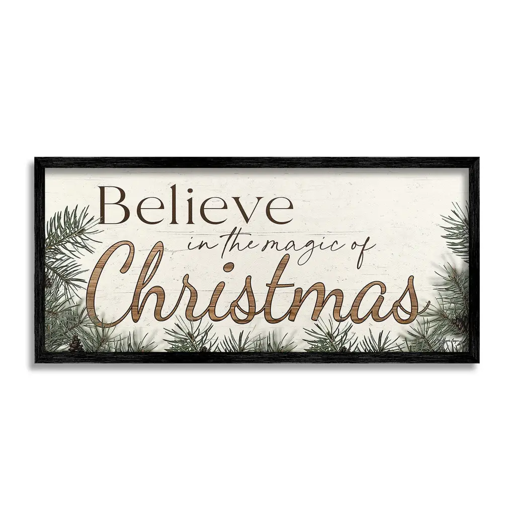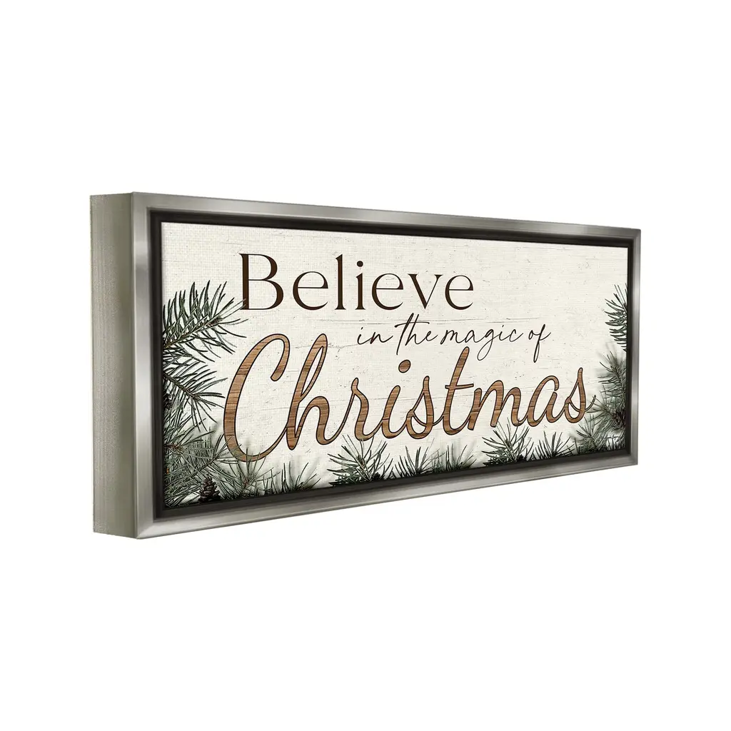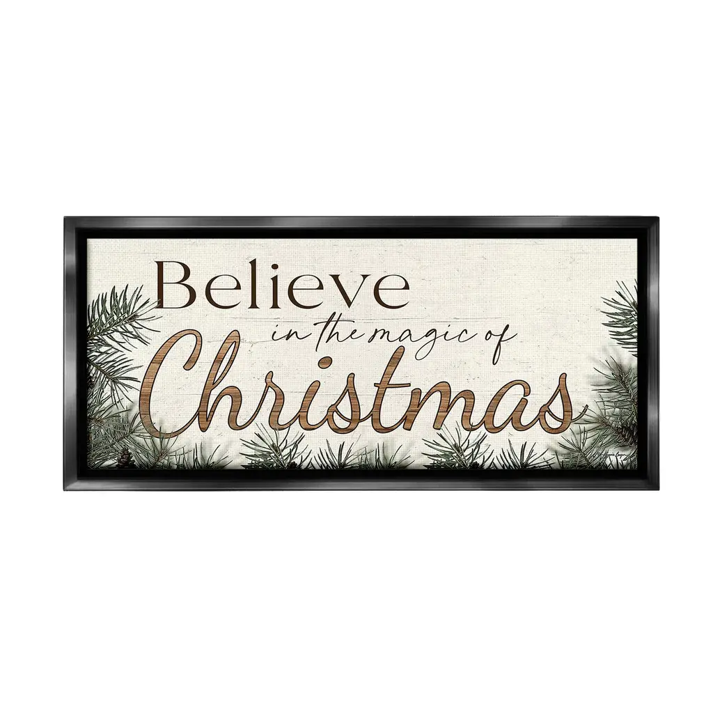Elevate your home or office to the next level with Stupell Framed Floating Canvas Wall Art. Our premium hand-stretched canvas is mounted securely into a sturdy lightweight frame. The museum-style gap between the wrapped canvas and the box frame gives the illusion of floating artwork. Stupell Wall Art is made in the USA.Features: Dimensions: 25 x 1.7 x 11 Frame, 24 x 1.5 x 10 Canvas ArtFloating Frame Canvas Products are available in sizes 25"x11" and 31"x14". All Floating Frame Canvas Products have a 1.7" Depth.Wall Art is Ready to Hang with Hardware Free Hanging. No Installation required. For Easy Set Up Lean or Layer Artwork on Shelf or Against Wall. Artwork is Permently Fixed into the Frame.Our elevated 1.7" Thick Floating Frame is the perfect complement to our canvas style Wall Art. We use only the highest quality inks in house with industry leading printing solutions. Canvas is hand stretched over a durable wood foundation and then mounted securly into a Modern Box Frame. Made in the USA.Artwork Relates To: Winter, Seasonal, Holiday, Christmas, Tree, Fir, Rustic, Country, Cabin, Believe in the Magic of ChristmasDesign by Susie Boyer