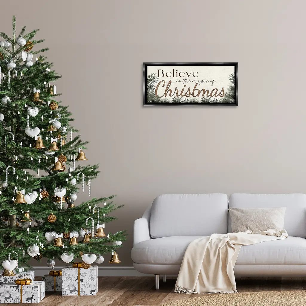 Elevate your home or office to the next level with Stupell Framed Floating Canvas Wall Art. Our premium hand-stretched canvas is mounted securely into a sturdy lightweight frame. The museum-style gap between the wrapped canvas and the box frame gives the illusion of floating artwork. Stupell Wall Art is made in the USA.Features: Dimensions: 25 x 1.7 x 11 Frame, 24 x 1.5 x 10 Canvas ArtFloating Frame Canvas Products are available in sizes 25"x11" and 31"x14". All Floating Frame Canvas Products have a 1.7" Depth.Wall Art is Ready to Hang with Hardware Free Hanging. No Installation required. For Easy Set Up Lean or Layer Artwork on Shelf or Against Wall. Artwork is Permently Fixed into the Frame.Our elevated 1.7" Thick Floating Frame is the perfect complement to our canvas style Wall Art. We use only the highest quality inks in house with industry leading printing solutions. Canvas is hand stretched over a durable wood foundation and then mounted securly into a Modern Box Frame. Made in the USA.Artwork Relates To: Winter, Seasonal, Holiday, Christmas, Tree, Fir, Rustic, Country, Cabin, Believe in the Magic of ChristmasDesign by Susie Boyer