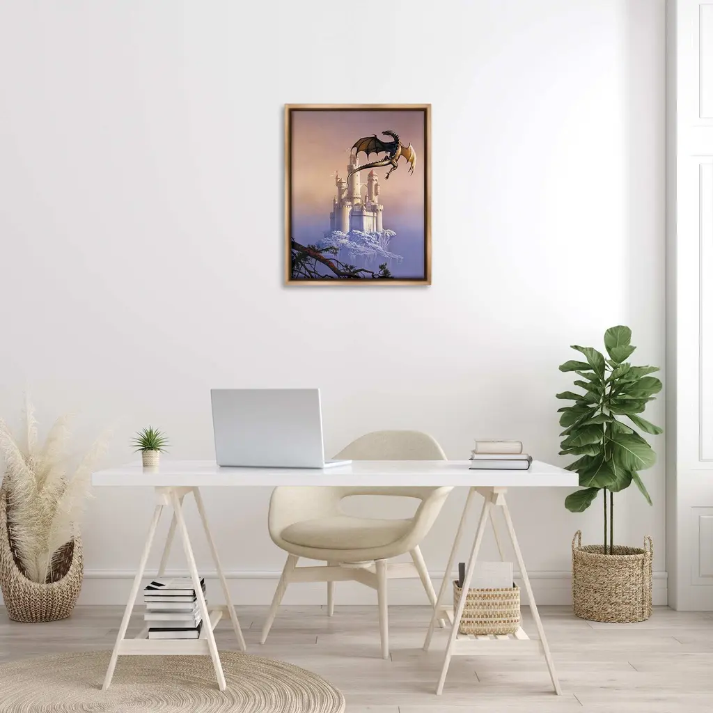 Elevate your home or office to the next level with Stupell Framed Floating Canvas Wall Art. Our premium hand-stretched canvas is mounted securely into a sturdy lightweight frame. The museum-style gap between the wrapped canvas and the box frame gives the illusion of floating artwork. Stupell Wall Art is made in the USA.Features: Dimensions: 17 x 1.7 x 21 Frame, 16 x 1.5 x 20 Canvas ArtFloating Frame Canvas Products are available in sizes 17"x21" and 25"x31". All Floating Frame Canvas Products have a 1.7" Depth.Wall Art is Ready to Hang with Hardware Free Hanging. No Installation required. For Easy Set Up Lean or Layer Artwork on Shelf or Against Wall. Artwork is Permently Fixed into the Frame.Our elevated 1.7" Thick Floating Frame is the perfect complement to our canvas style Wall Art. We use only the highest quality inks in house with industry leading printing solutions. Canvas is hand stretched over a durable wood foundation and then mounted securly into a Modern Box Frame. Made in the USA.Artwork Relates To: Dragon, Architecture, Building, Castle, Fortress, Animal, Reptile, Landscape, Surreal, Fantasy, Magical, Tree, BranchDesign by Ciruelo