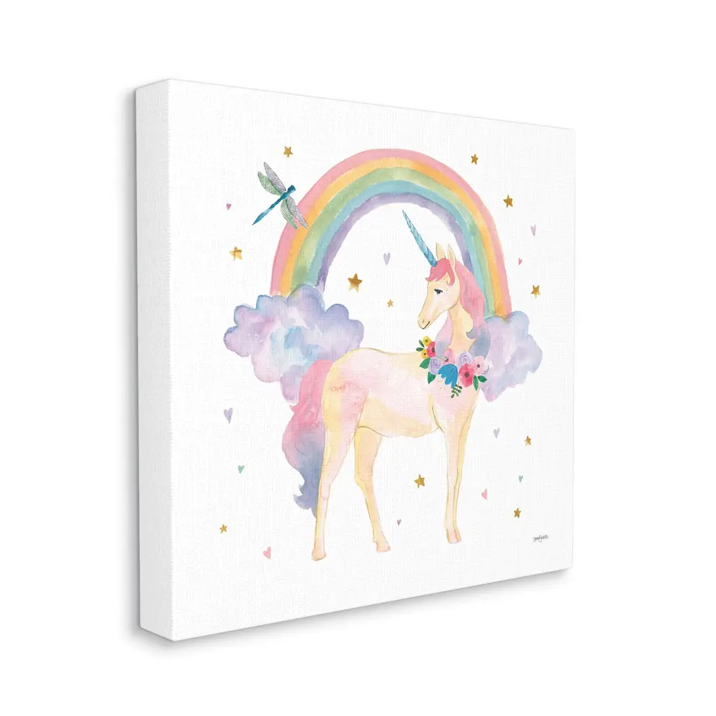 We create our stretched canvas to the highest standards. Using only the highest quality inks and canvas on Mimaki printers, we hand-cut and stretch each piece over a 1.5-inch thick wooden frame for hanging. As a result, the art comes ready to hang on the sturdy ledge with no installation required. Stupell Wall Art is made in the USA.Features: Dimensions: 17 x 1.5 x 17 InchesStretched Canvas Sizes Include Standard: 17 x 1.5 x 17 Large: 24 x 1.5 x 24 X-Large: 30 x 1.5 x 30 Oversized: 36 x 1.5 x 36Wall Art is Ready to Hang with Hardware Free Hanging. No installation required. For Easy Set Up Lean or Layer Artwork on Shelf or Against Wall.Our stretched canvas is created with the highest standards. We use only the highest quality inks and canvas on our in house Mimaki printers, and then hand cut and stretch each piece over a 1.5 inch thick wooden frame for hanging. Made In USA.Artwork Relates To: Unicorn, Fantasy, Rainbow, Nature, Cloud, Dragonfly, Flower, Floral, StarsDesign by Jenaya Jackson