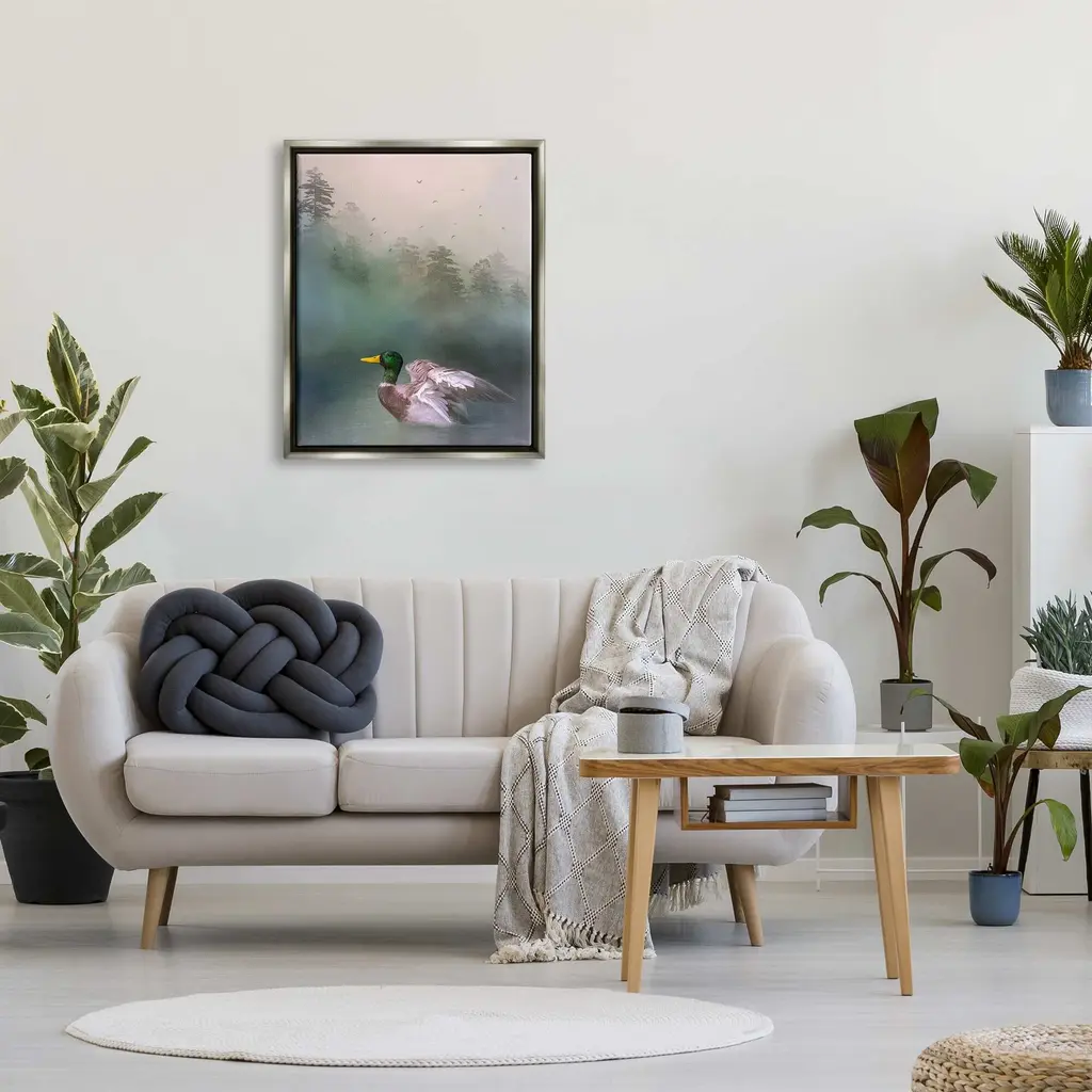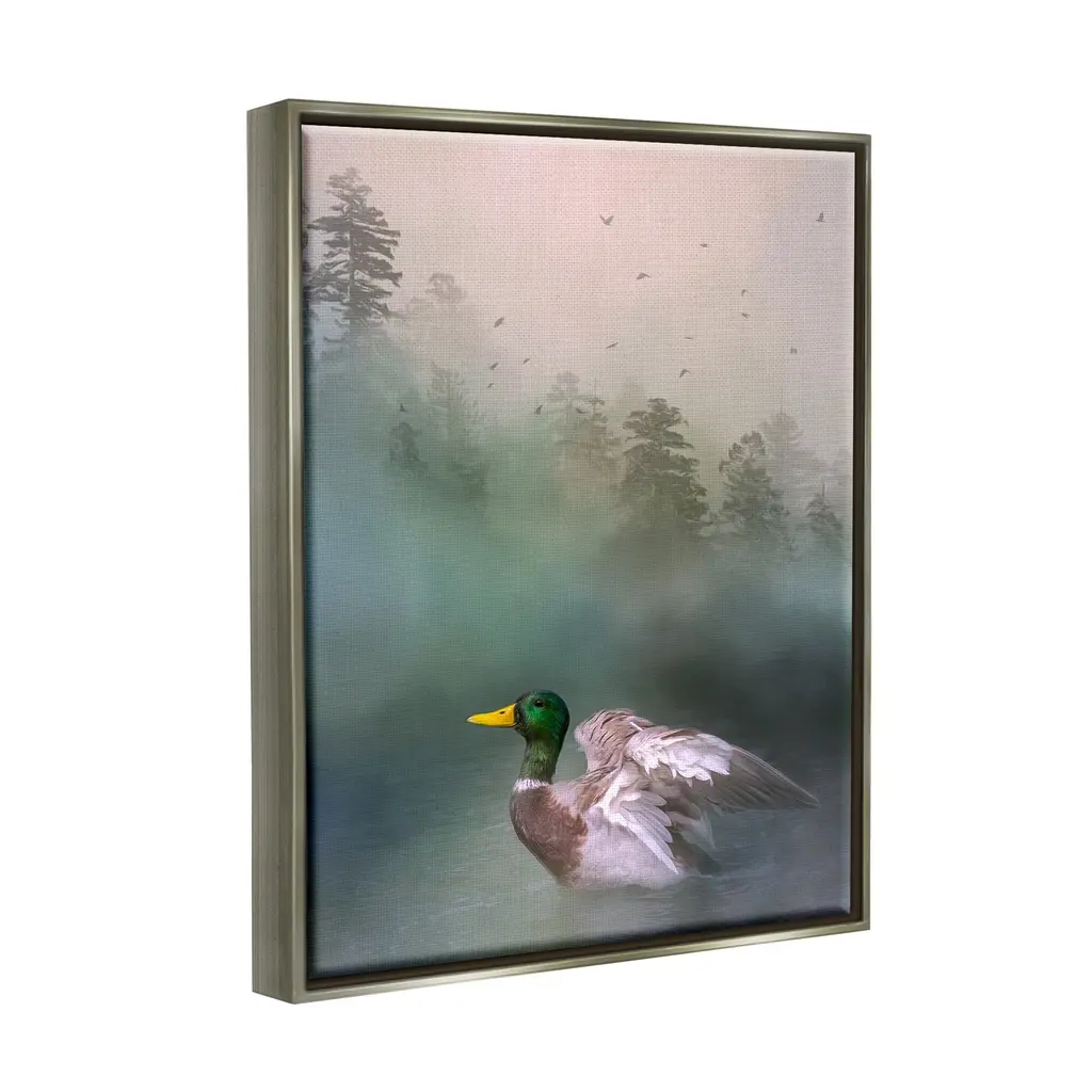 Elevate your home or office to the next level with Stupell Framed Floating Canvas Wall Art. Our premium hand stretched canvas is mounted securly into a sturdy lightweight frame. The museum style gap between wrapped canvas and box frame gives the illusion of floating artwork. Room Type: Living Room, Den, Hallway, Office, Entryway, Study, Dining Room or Bedroom, Guest Room, Studio, Dorm or BoudoirFeatures: Dimensions: 17 x 1.7 x 21 Frame, 16 x 1.5 x 20 Canvas ArtFloating Frame Sizes Include Standard: 17 x 1.7 x 21 Oversized: 25 x 1.7 x 31Wall Art is Ready to Hang - No Installation or Hardware Needed. For Easy Set Up Lean or Layer Artwork on Shelf or Against Wall.Our elevated 1.7" Thick Floating Frame is the perfect complement to our canvas style Wall Art. We use only the highest quality inks in house with industry leading printing solutions. Canvas is hand stretched over a durable wood foundation and then mounted securly into a Modern Box Frame. Made in the USA.Artwork Relates To: Animal, Bird, Duck, Mallard, Waterfowl, Nature, Fog, WildlifeDesign by Kelley Parker