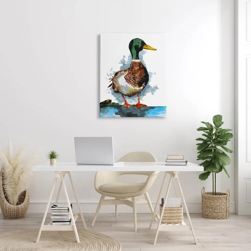 Proudly made in the USA, Our stretched canvas is created with the highest standards. We use only the highest quality inks and canvas on our in house Mimaki printers, and then hand cut and stretch each piece over a 1.5 inch thick wooden frame for hanging. The art comes ready to hang with no installation required.Features: Dimensions: 16 x 1.5 x 20 InchesStretched Canvas Sizes Include Standard: 16 x 1.5 x 20 Large: 20 x 1.5 x 30 X-Large: 30 x 1.5 x 40 Oversized: 36 x 1.5 x 48Wall Art is Ready to Hang - No Installation or Hardware Needed. For Easy Set Up Lean or Layer Artwork on Shelf or Against Wall.Our stretched canvas is created with the highest standards. We use only the highest quality inks and canvas on our in house Mimaki printers, and then hand cut and stretch each piece over a 1.5 inch thick wooden frame for hanging. Made In USA.Artwork Relates To: Bird, Animal, Duck, Mallard, Water, Lake, PondDesign by Sebastian Grafmann