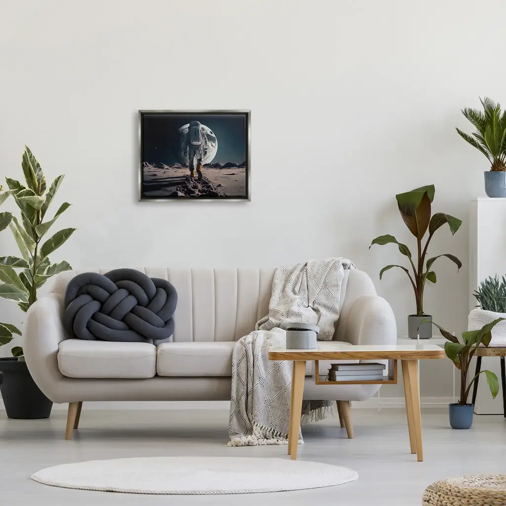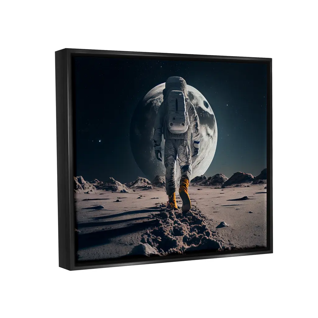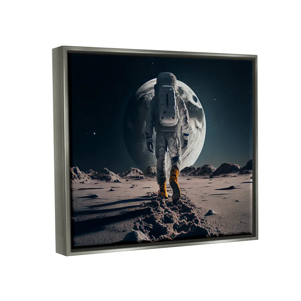 Elevate your home or office to the next level with Stupell Framed Floating Canvas Wall Art. Our premium hand-stretched canvas is mounted securely into a sturdy lightweight frame. The museum-style gap between the wrapped canvas and the box frame gives the illusion of floating artwork. Stupell Wall Art is made in the USA.Features: Dimensions: 21 x 1.7 x 17 Frame, 20 x 1.5 x 16 Canvas ArtFloating Frame Sizes Include Standard: 21 x 1.7 x 17 Oversized: 31 x 1.7 x 25Wall Art is Ready to Hang - No Installation or Hardware Needed. For Easy Set Up Lean or Layer Artwork on Shelf or Against Wall.Our elevated 1.7" Thick Floating Frame is the perfect complement to our canvas style Wall Art. We use only the highest quality inks in house with industry leading printing solutions. Canvas is hand stretched over a durable wood foundation and then mounted securly into a Modern Box Frame. Made in the USA.Artwork Relates To: Astronomy, Moon, Person, Outer Space, Astronaut, Planet, EarthDesign by CyberGeek Design