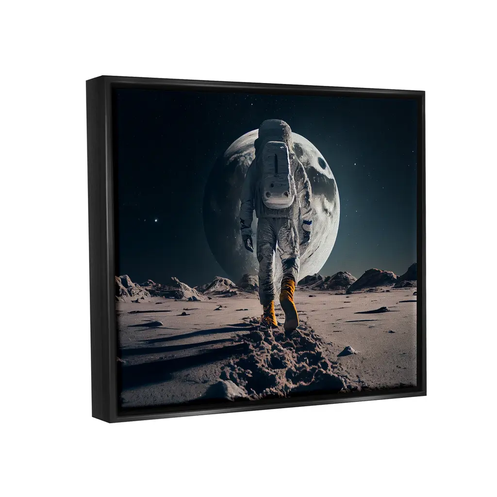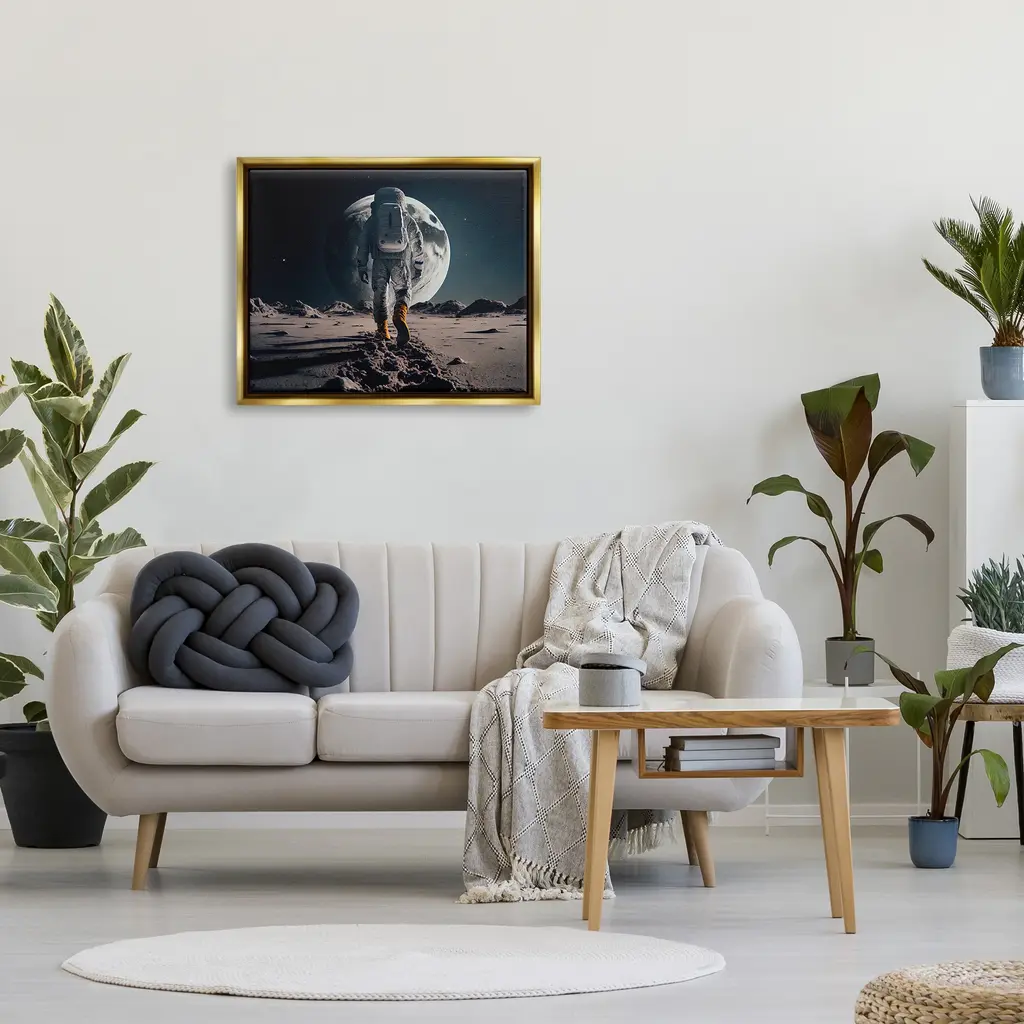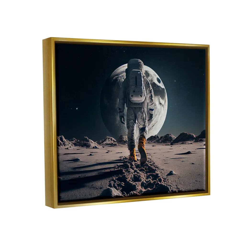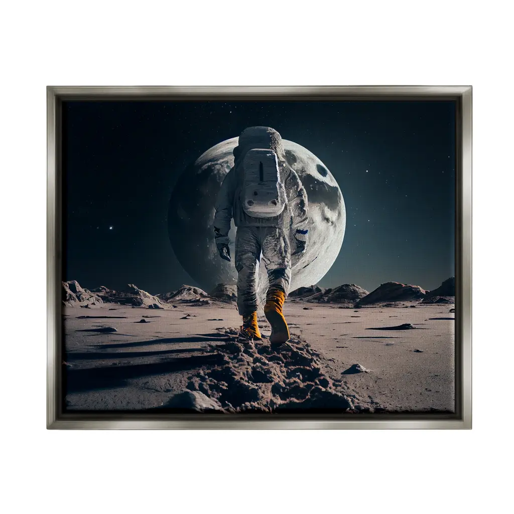 Elevate your home or office to the next level with Stupell Framed Floating Canvas Wall Art. Our premium hand-stretched canvas is mounted securely into a sturdy lightweight frame. The museum-style gap between the wrapped canvas and the box frame gives the illusion of floating artwork. Stupell Wall Art is made in the USA.Features: Dimensions: 21 x 1.7 x 17 Frame, 20 x 1.5 x 16 Canvas ArtFloating Frame Sizes Include Standard: 21 x 1.7 x 17 Oversized: 31 x 1.7 x 25Wall Art is Ready to Hang - No Installation or Hardware Needed. For Easy Set Up Lean or Layer Artwork on Shelf or Against Wall.Our elevated 1.7" Thick Floating Frame is the perfect complement to our canvas style Wall Art. We use only the highest quality inks in house with industry leading printing solutions. Canvas is hand stretched over a durable wood foundation and then mounted securly into a Modern Box Frame. Made in the USA.Artwork Relates To: Astronomy, Moon, Person, Outer Space, Astronaut, Planet, EarthDesign by CyberGeek Design