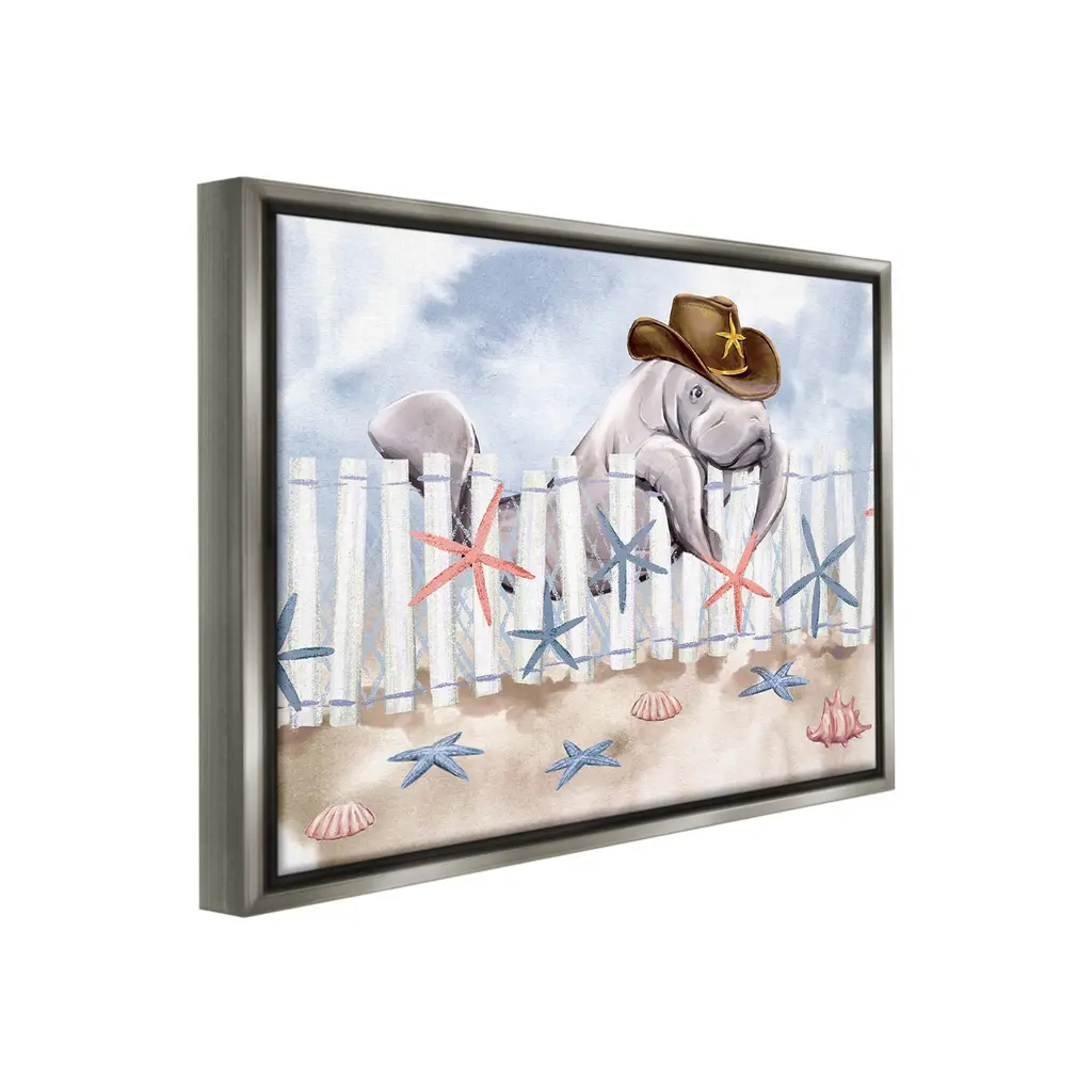 Elevate your home or office to the next level with Stupell Framed Floating Canvas Wall Art. Our premium hand-stretched canvas is mounted securely into a sturdy lightweight frame. The museum-style gap between the wrapped canvas and the box frame gives the illusion of floating artwork. Stupell Wall Art is made in the USA.Features: Dimensions: 21 x 1.7 x 17 Frame, 20 x 1.5 x 16 Canvas ArtFloating Frame Canvas Products are available in sizes 21"x17" and 31"x25". All Floating Frame Canvas Products have a 1.7" Depth.Wall Art is Ready to Hang with Hardware Free Hanging. No Installation required. For Easy Set Up Lean or Layer Artwork on Shelf or Against Wall. Artwork is Permently Fixed into the Frame.Our elevated 1.7" Thick Floating Frame is the perfect complement to our canvas style Wall Art. We use only the highest quality inks in house with industry leading printing solutions. Canvas is hand stretched over a durable wood foundation and then mounted securly into a Modern Box Frame. Made in the USA.Artwork Relates To: Fence, Animal, Sea Life, Cowboy Hat, Nautical, Starfish, Manatee, BeachDesign by Ziwei Li
