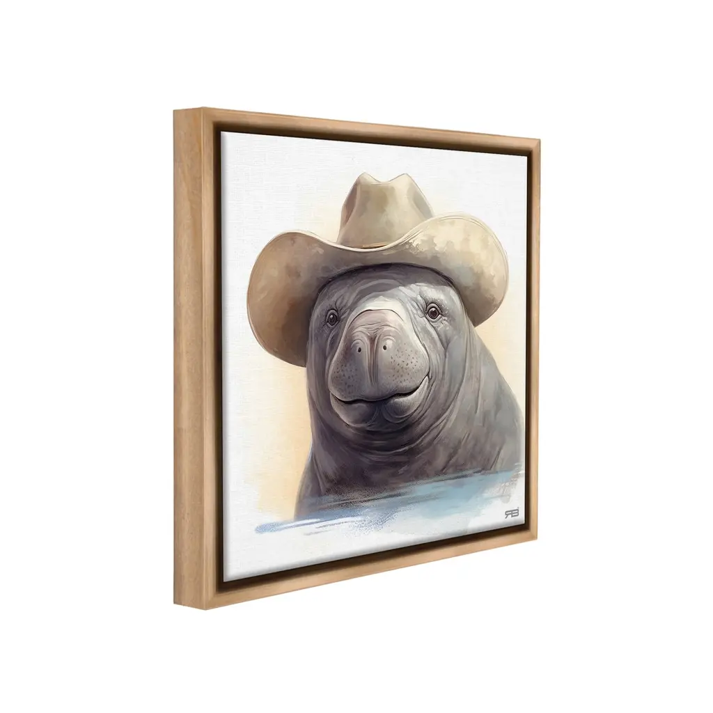 Elevate your home or office to the next level with Stupell Framed Floating Canvas Wall Art. Our premium hand-stretched canvas is mounted securely into a sturdy lightweight frame. The museum-style gap between the wrapped canvas and the box frame gives the illusion of floating artwork. Stupell Wall Art is made in the USA.Features: Dimensions: 18 x 1.7 x 18 Frame, 17 x 1.5 x 17 Canvas ArtFloating Frame Canvas Products are available in sizes 18"x18" and 25"x25". All Floating Frame Canvas Products have a 1.7" Depth.Wall Art is Ready to Hang with Hardware Free Hanging. No Installation required. For Easy Set Up Lean or Layer Artwork on Shelf or Against Wall. Artwork is Permently Fixed into the Frame.Our elevated 1.7" Thick Floating Frame is the perfect complement to our canvas style Wall Art. We use only the highest quality inks in house with industry leading printing solutions. Canvas is hand stretched over a durable wood foundation and then mounted securly into a Modern Box Frame. Made in the USA.Artwork Relates To: Animal, Mammal, Wildlife, Manatee, Sea Life, Cowboy Hat, Nautical, MarineDesign by RB