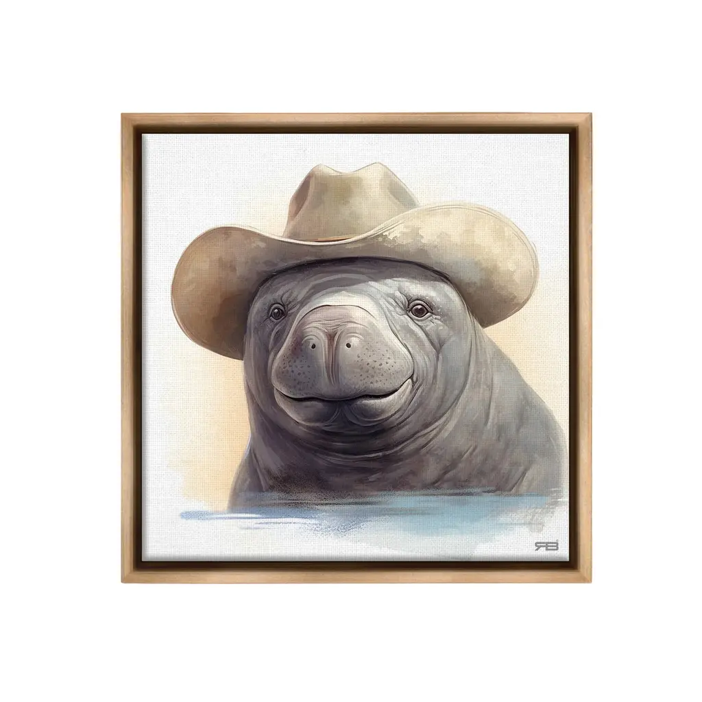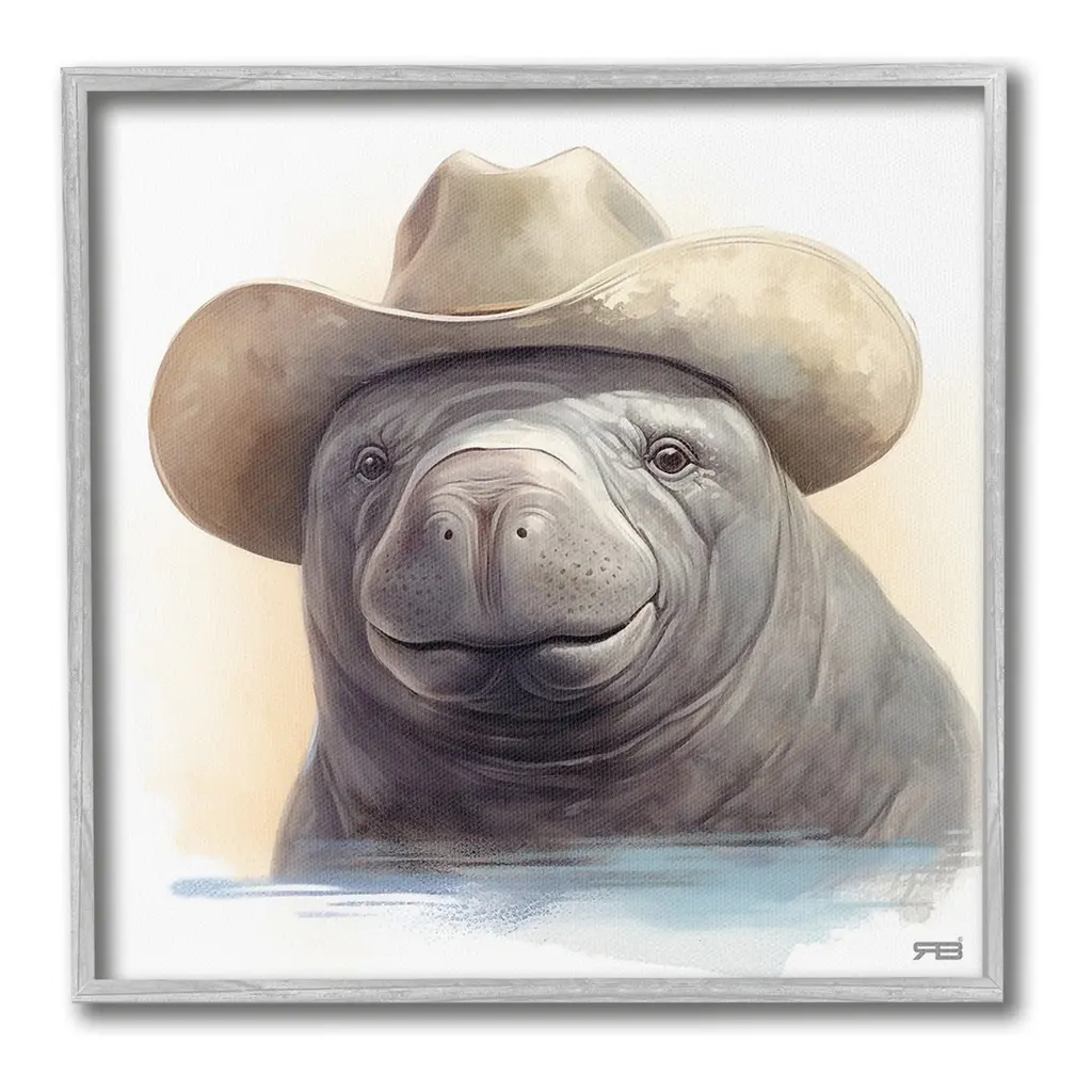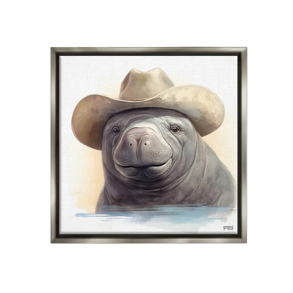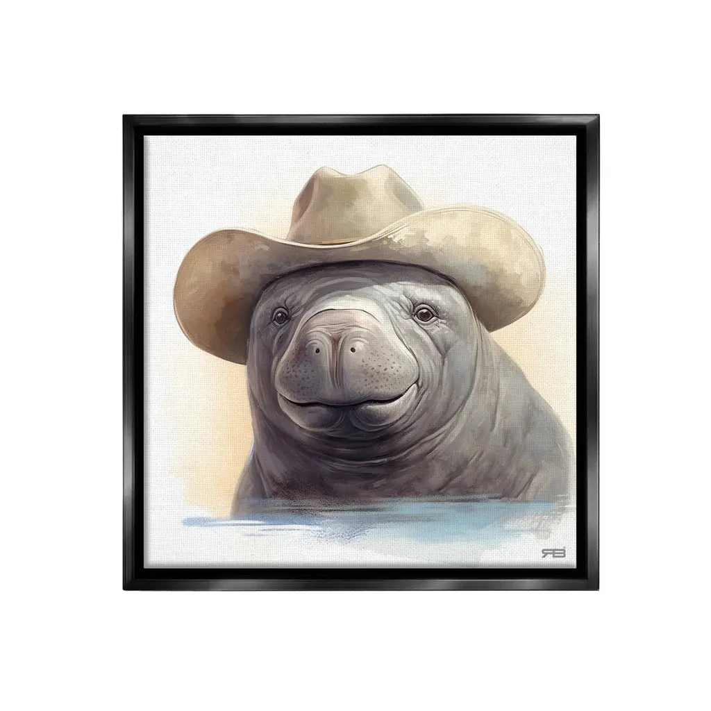 Elevate your home or office to the next level with Stupell Framed Floating Canvas Wall Art. Our premium hand-stretched canvas is mounted securely into a sturdy lightweight frame. The museum-style gap between the wrapped canvas and the box frame gives the illusion of floating artwork. Stupell Wall Art is made in the USA.Features: Dimensions: 18 x 1.7 x 18 Frame, 17 x 1.5 x 17 Canvas ArtFloating Frame Canvas Products are available in sizes 18"x18" and 25"x25". All Floating Frame Canvas Products have a 1.7" Depth.Wall Art is Ready to Hang with Hardware Free Hanging. No Installation required. For Easy Set Up Lean or Layer Artwork on Shelf or Against Wall. Artwork is Permently Fixed into the Frame.Our elevated 1.7" Thick Floating Frame is the perfect complement to our canvas style Wall Art. We use only the highest quality inks in house with industry leading printing solutions. Canvas is hand stretched over a durable wood foundation and then mounted securly into a Modern Box Frame. Made in the USA.Artwork Relates To: Animal, Mammal, Wildlife, Manatee, Sea Life, Cowboy Hat, Nautical, MarineDesign by RB