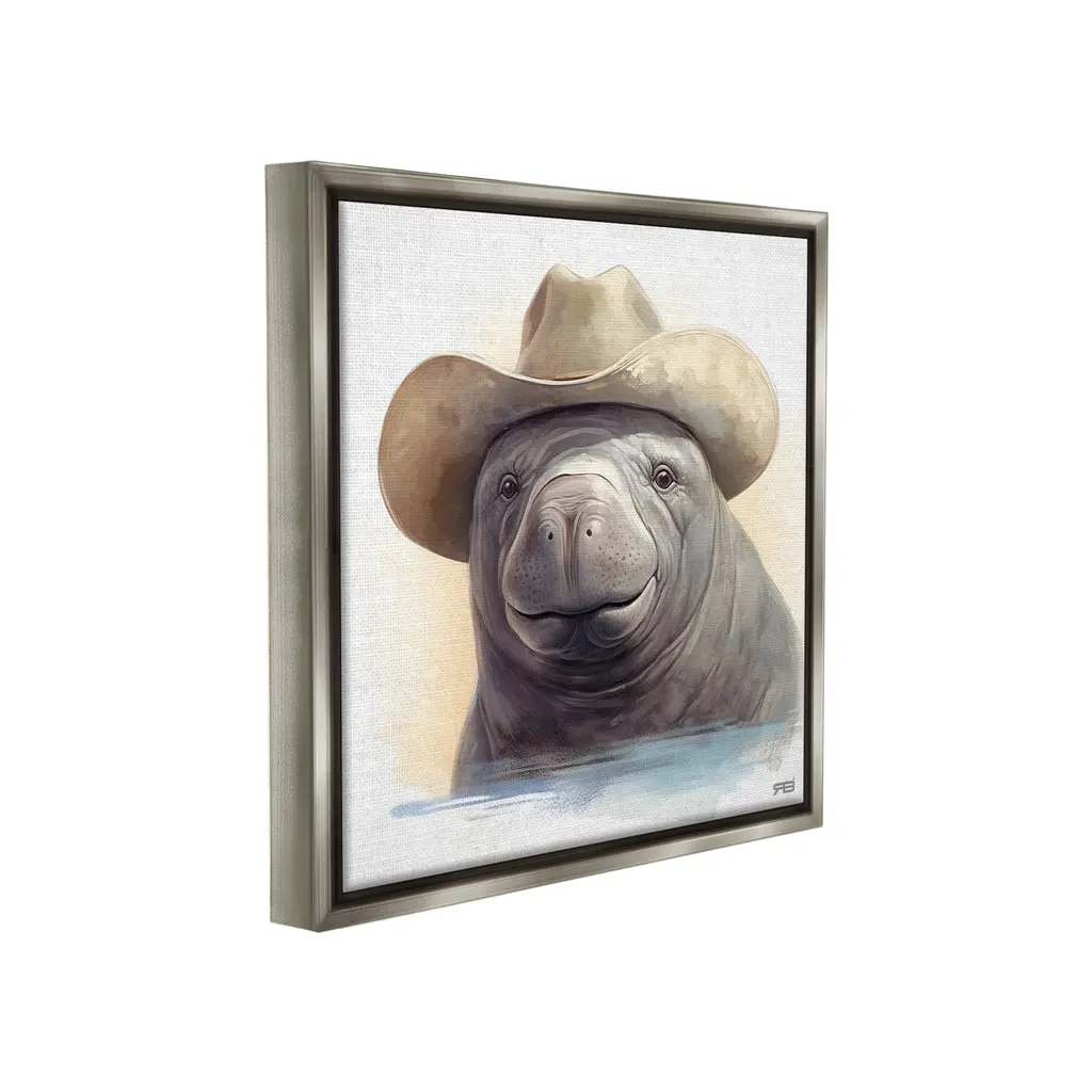 Elevate your home or office to the next level with Stupell Framed Floating Canvas Wall Art. Our premium hand-stretched canvas is mounted securely into a sturdy lightweight frame. The museum-style gap between the wrapped canvas and the box frame gives the illusion of floating artwork. Stupell Wall Art is made in the USA.Features: Dimensions: 18 x 1.7 x 18 Frame, 17 x 1.5 x 17 Canvas ArtFloating Frame Canvas Products are available in sizes 18"x18" and 25"x25". All Floating Frame Canvas Products have a 1.7" Depth.Wall Art is Ready to Hang with Hardware Free Hanging. No Installation required. For Easy Set Up Lean or Layer Artwork on Shelf or Against Wall. Artwork is Permently Fixed into the Frame.Our elevated 1.7" Thick Floating Frame is the perfect complement to our canvas style Wall Art. We use only the highest quality inks in house with industry leading printing solutions. Canvas is hand stretched over a durable wood foundation and then mounted securly into a Modern Box Frame. Made in the USA.Artwork Relates To: Animal, Mammal, Wildlife, Manatee, Sea Life, Cowboy Hat, Nautical, MarineDesign by RB