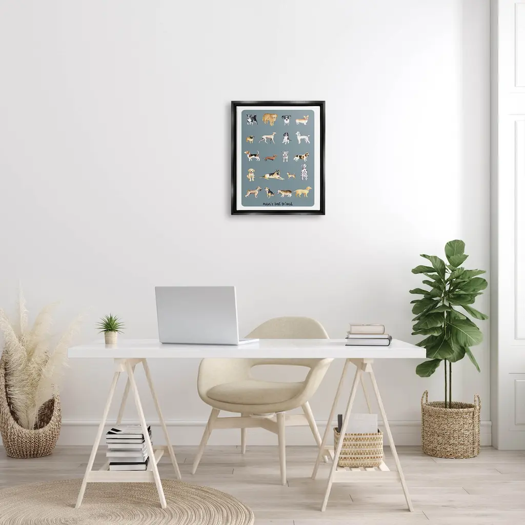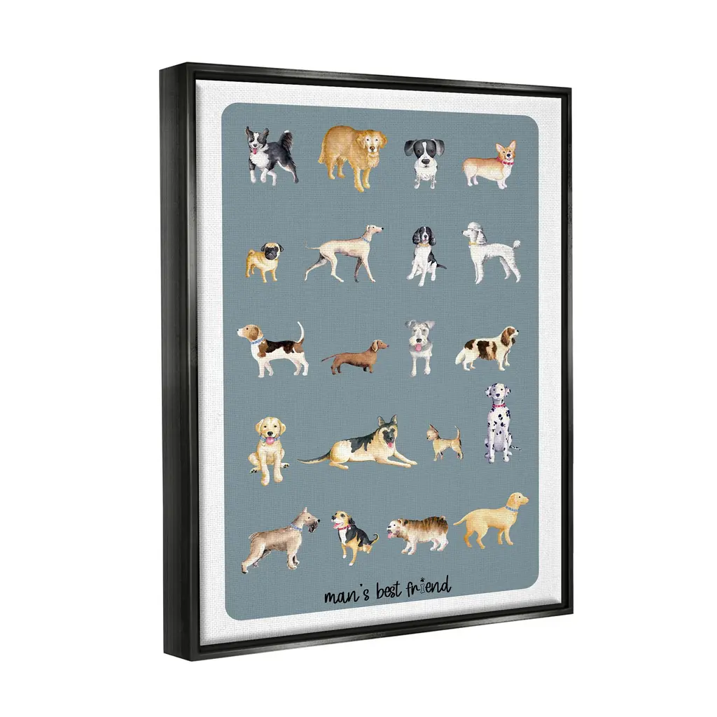 Elevate your home or office to the next level with Stupell Framed Floating Canvas Wall Art. Our premium hand stretched canvas is mounted securly into a sturdy lightweight frame. The museum style gap between wrapped canvas and box frame gives the illusion of floating artwork. Features: Dimensions: 17 x 1.7 x 21 Frame, 16 x 1.5 x 20 Canvas ArtFloating Frame Sizes Include Standard: 17 x 1.7 x 21 Oversized: 25 x 1.7 x 31Wall Art is Ready to Hang - No Installation or Hardware Needed. For Easy Set Up Lean or Layer Artwork on Shelf or Against Wall.Our elevated 1.7" Thick Floating Frame is the perfect complement to our canvas style Wall Art. We use only the highest quality inks in house with industry leading printing solutions. Canvas is hand stretched over a durable wood foundation and then mounted securly into a Modern Box Frame. Made in the USA.Artwork Relates To: Dog, Canine, Pet, Mammal, Animal, Hound, Bulldog, Puppy, Boxer, Pitbull, Terrier, Labrador Retriever, Husky, Pug, Beagle, Dog BreedsDesign by Andi MetzLiving Room, Den, Hallway, Office, Entryway, Study, Dining Room or Bed Room.Text Includes: Man's Best Friend