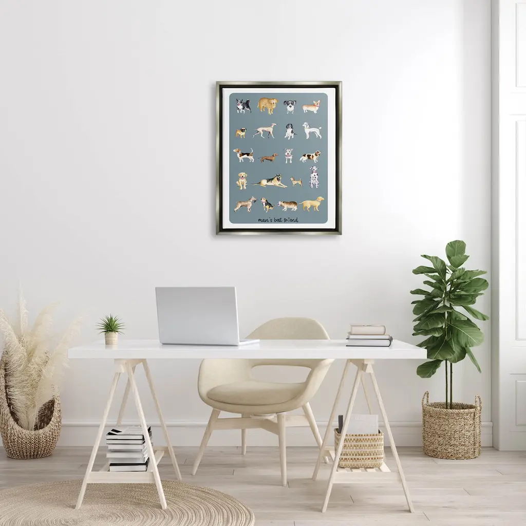 Elevate your home or office to the next level with Stupell Framed Floating Canvas Wall Art. Our premium hand stretched canvas is mounted securly into a sturdy lightweight frame. The museum style gap between wrapped canvas and box frame gives the illusion of floating artwork. Features: Dimensions: 17 x 1.7 x 21 Frame, 16 x 1.5 x 20 Canvas ArtFloating Frame Sizes Include Standard: 17 x 1.7 x 21 Oversized: 25 x 1.7 x 31Wall Art is Ready to Hang - No Installation or Hardware Needed. For Easy Set Up Lean or Layer Artwork on Shelf or Against Wall.Our elevated 1.7" Thick Floating Frame is the perfect complement to our canvas style Wall Art. We use only the highest quality inks in house with industry leading printing solutions. Canvas is hand stretched over a durable wood foundation and then mounted securly into a Modern Box Frame. Made in the USA.Artwork Relates To: Dog, Canine, Pet, Mammal, Animal, Hound, Bulldog, Puppy, Boxer, Pitbull, Terrier, Labrador Retriever, Husky, Pug, Beagle, Dog BreedsDesign by Andi MetzLiving Room, Den, Hallway, Office, Entryway, Study, Dining Room or Bed Room.Text Includes: Man's Best Friend