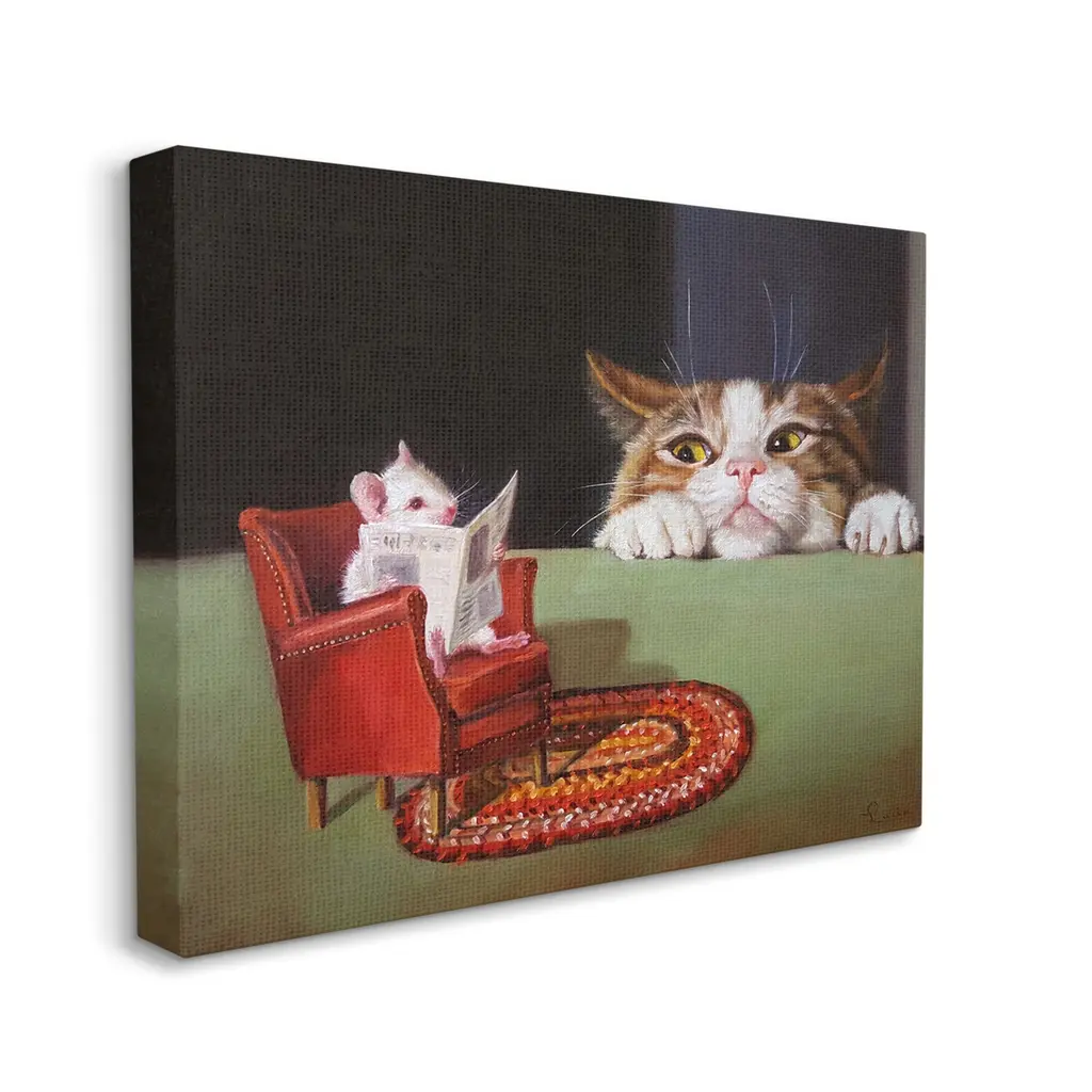 We create our stretched canvas to the highest standards. Using only the highest quality inks and canvas on Mimaki printers, we hand-cut and stretch each piece over a 1.5-inch thick wooden frame for hanging. As a result, the art comes ready to hang on the sturdy ledge with no installation required. Stupell Wall Art is made in the USA.Features: Dimensions: 20 x 1.5 x 16 InchesStretched Canvas Sizes Include Standard: 20 x 1.5 x 16 Large: 30 x 1.5 x 20 X-Large: 40 x 1.5 x 30 Oversized: 48 x 1.5 x 36Wall Art is Ready to Hang with Hardware Free Hanging. No installation required. For Easy Set Up Lean or Layer Artwork on Shelf or Against Wall.Our stretched canvas is created with the highest standards. We use only the highest quality inks and canvas on our in house Mimaki printers, and then hand cut and stretch each piece over a 1.5 inch thick wooden frame for hanging. Made In USA.Artwork Relates To: Chair, Animal, Cat, Mammal, Pet, Rat, Rodent, Armchair, Painting, Angora, ManxDesign by Lucia Heffernan