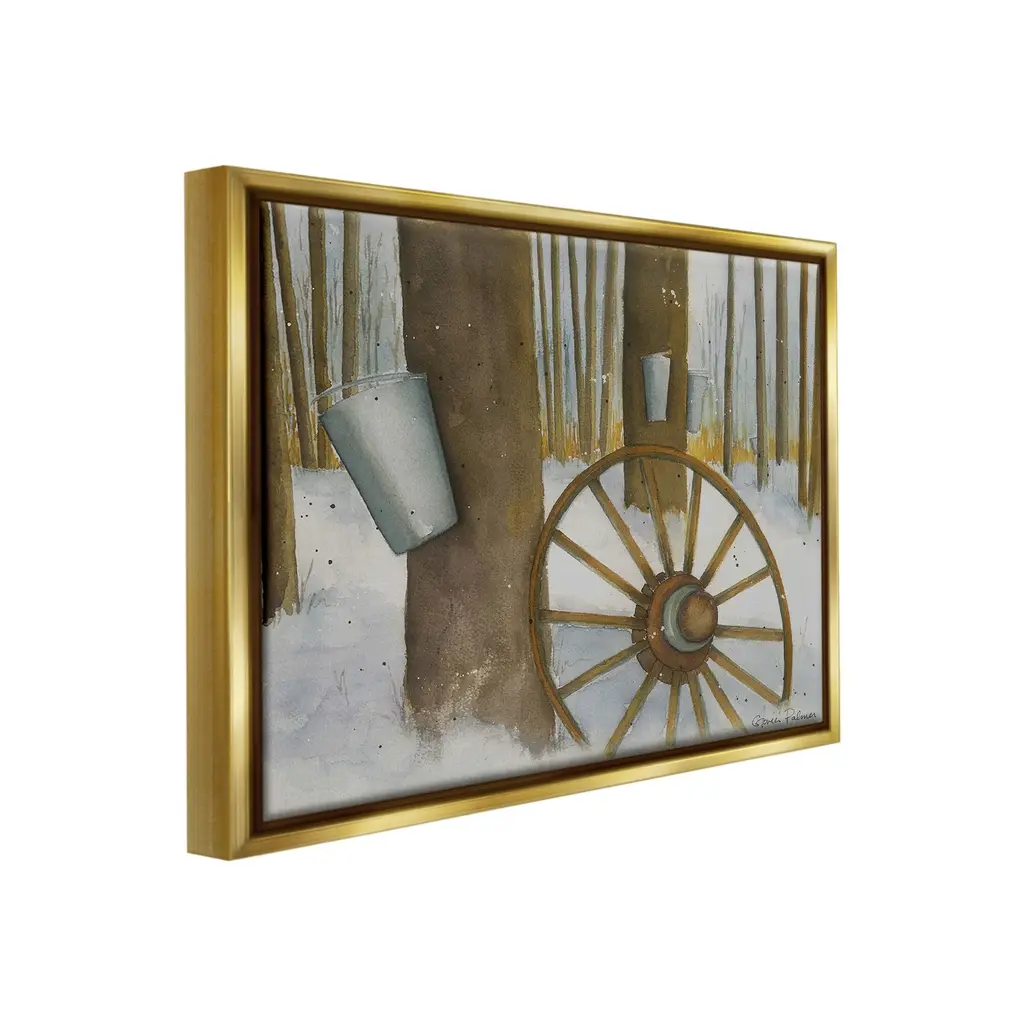 Elevate your home or office to the next level with Stupell Framed Floating Canvas Wall Art. Our premium hand-stretched canvas is mounted securely into a sturdy lightweight frame. The museum-style gap between the wrapped canvas and the box frame gives the illusion of floating artwork. Stupell Wall Art is made in the USA.Features: Dimensions: 21 x 1.7 x 17 Frame, 20 x 1.5 x 16 Canvas ArtFloating Frame Canvas Products are available in sizes 21"x17" and 31"x25". All Floating Frame Canvas Products have a 1.7" Depth.Wall Art is Ready to Hang with Hardware Free Hanging. No Installation required. For Easy Set Up Lean or Layer Artwork on Shelf or Against Wall. Artwork is Permently Fixed into the Frame.Our elevated 1.7" Thick Floating Frame is the perfect complement to our canvas style Wall Art. We use only the highest quality inks in house with industry leading printing solutions. Canvas is hand stretched over a durable wood foundation and then mounted securly into a Modern Box Frame. Made in the USA.Artwork Relates To: Wheel, Spoke, Nature, Woodland, Country, Snow, Winter, Rustic, Maple SyrupDesign by Gloria Palmer