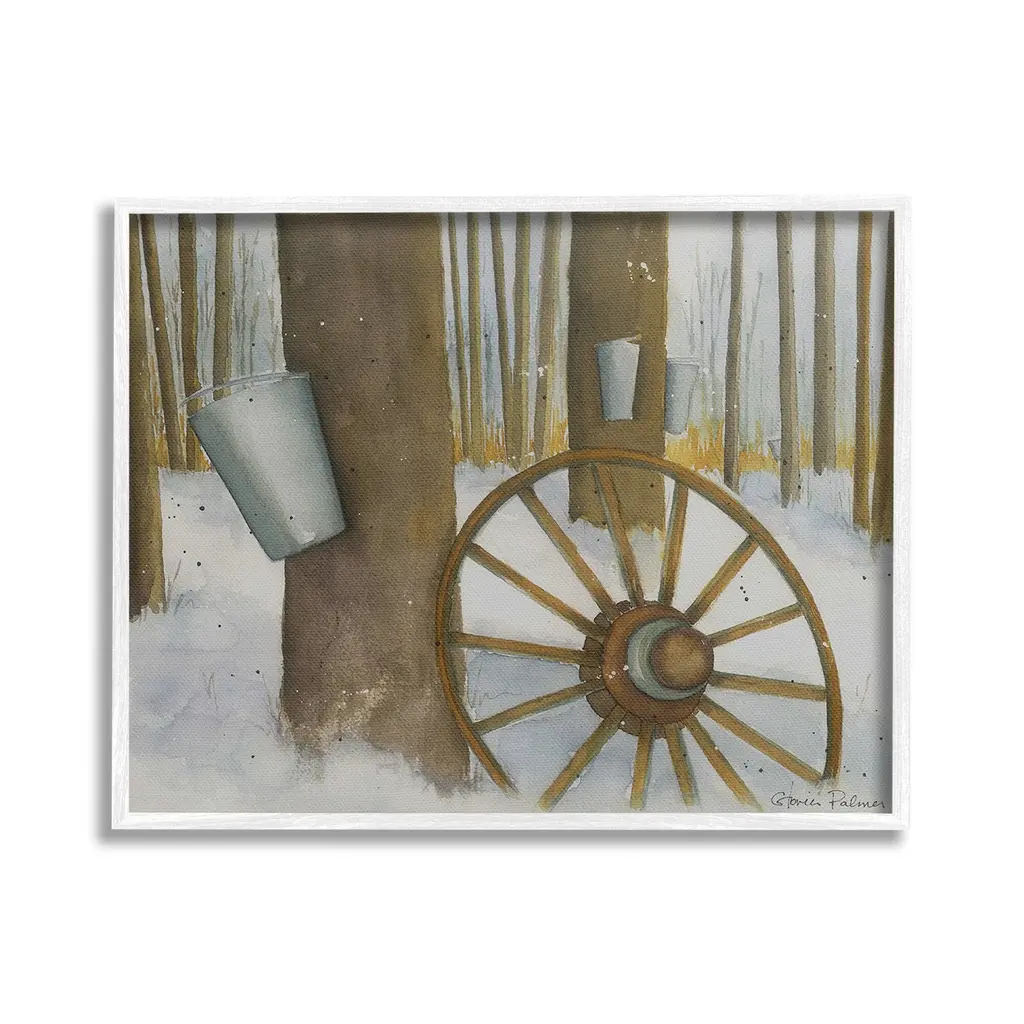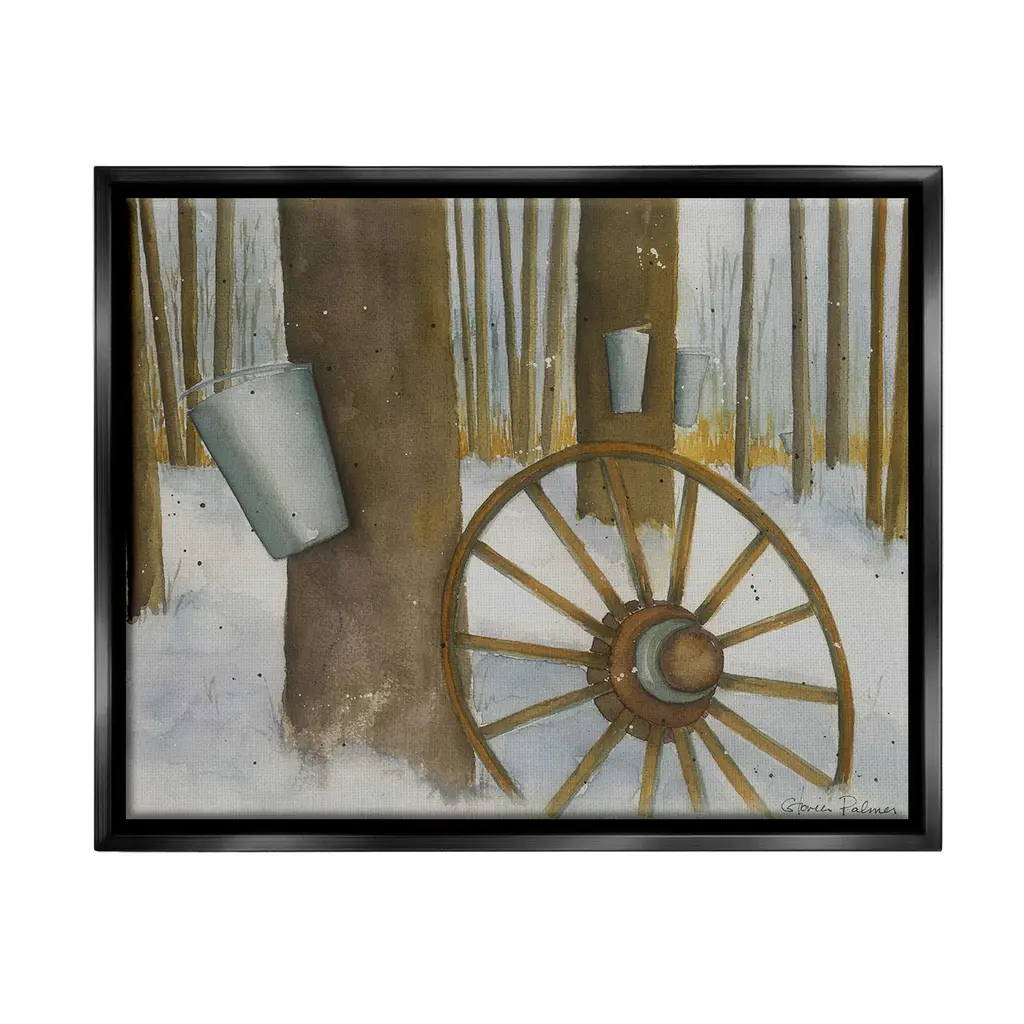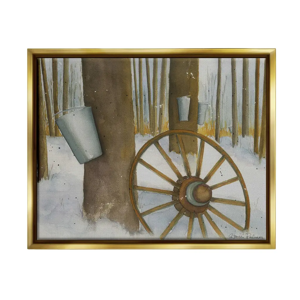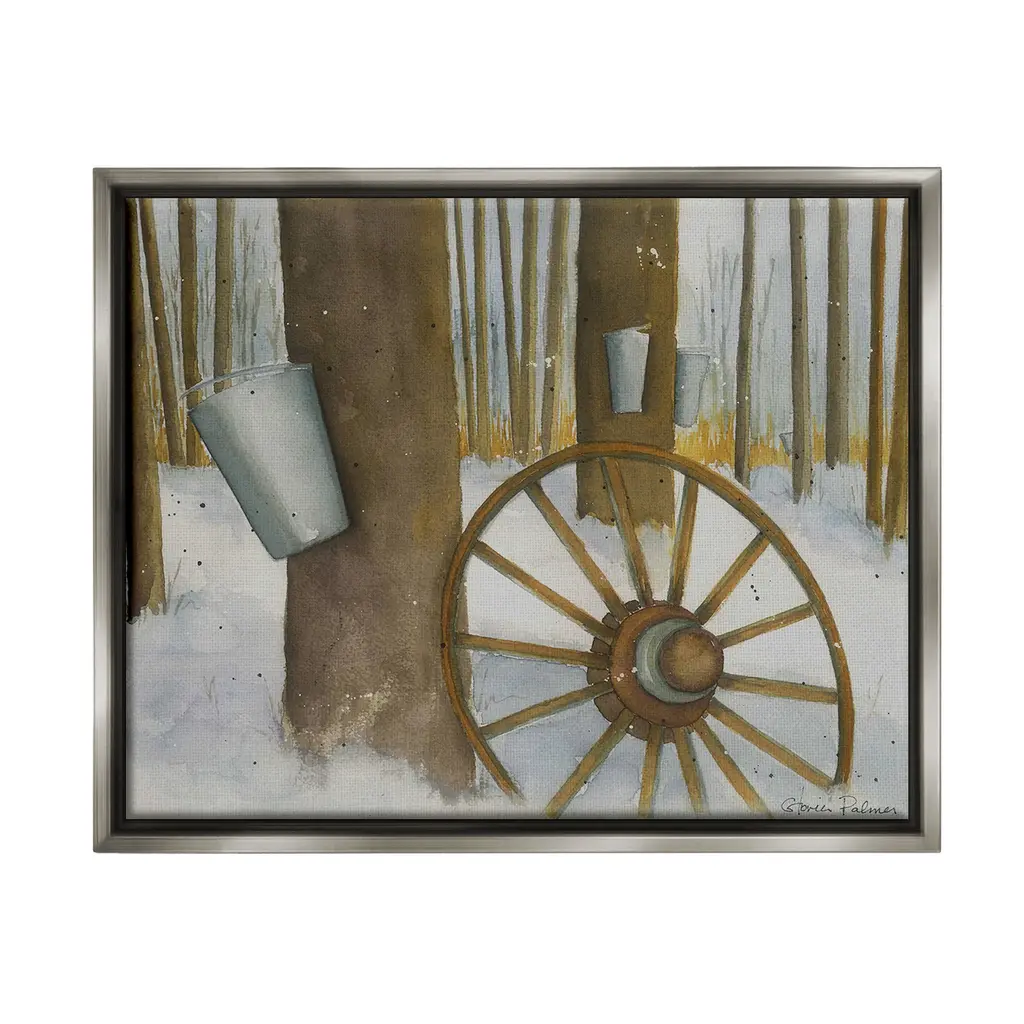 Elevate your home or office to the next level with Stupell Framed Floating Canvas Wall Art. Our premium hand-stretched canvas is mounted securely into a sturdy lightweight frame. The museum-style gap between the wrapped canvas and the box frame gives the illusion of floating artwork. Stupell Wall Art is made in the USA.Features: Dimensions: 21 x 1.7 x 17 Frame, 20 x 1.5 x 16 Canvas ArtFloating Frame Canvas Products are available in sizes 21"x17" and 31"x25". All Floating Frame Canvas Products have a 1.7" Depth.Wall Art is Ready to Hang with Hardware Free Hanging. No Installation required. For Easy Set Up Lean or Layer Artwork on Shelf or Against Wall. Artwork is Permently Fixed into the Frame.Our elevated 1.7" Thick Floating Frame is the perfect complement to our canvas style Wall Art. We use only the highest quality inks in house with industry leading printing solutions. Canvas is hand stretched over a durable wood foundation and then mounted securly into a Modern Box Frame. Made in the USA.Artwork Relates To: Wheel, Spoke, Nature, Woodland, Country, Snow, Winter, Rustic, Maple SyrupDesign by Gloria Palmer