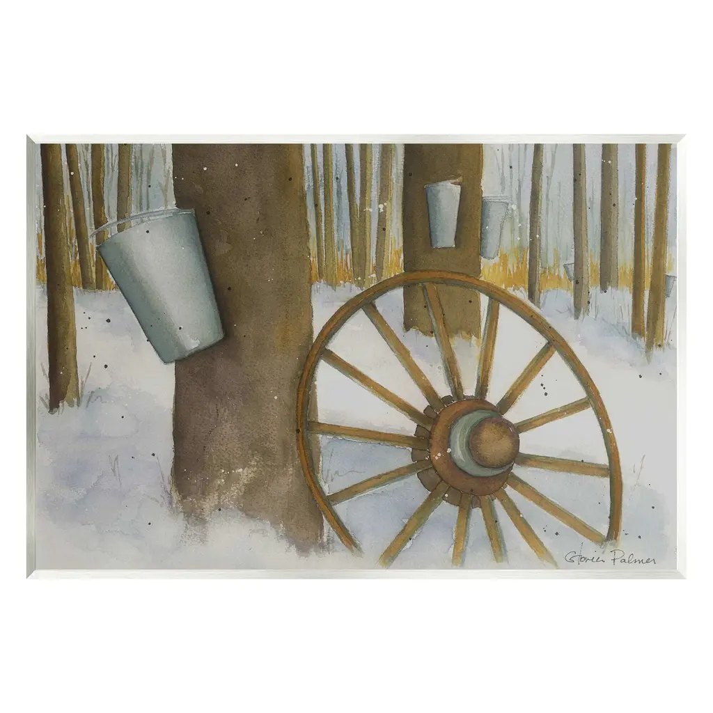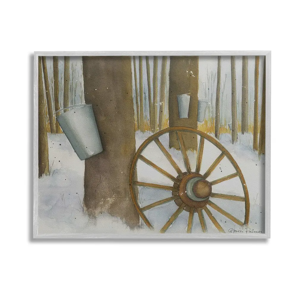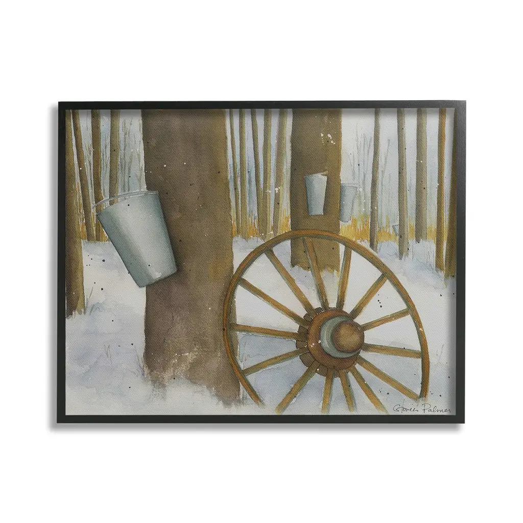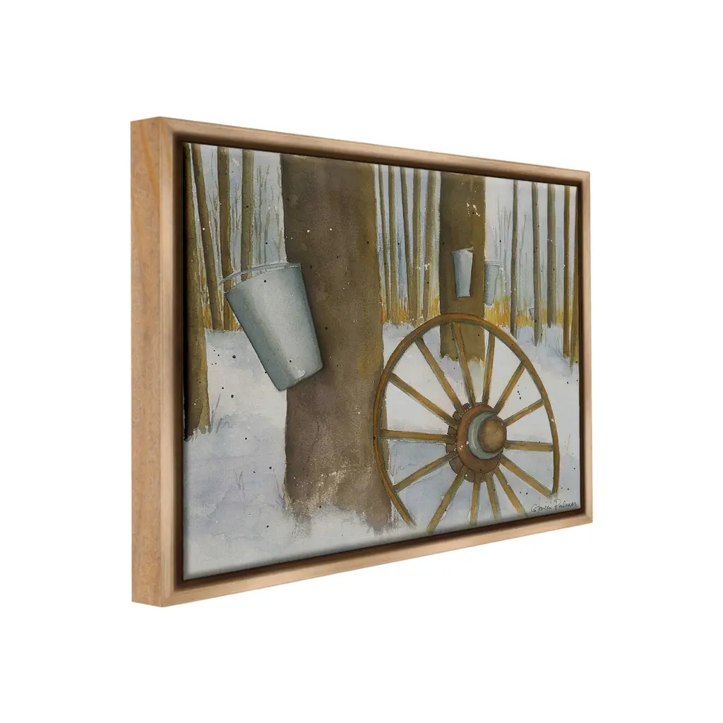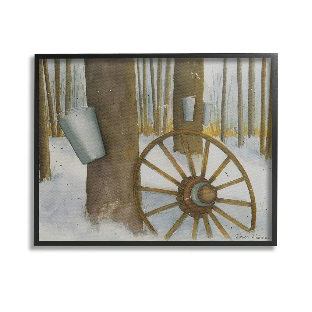 Elevate your home or office to the next level with Stupell Framed Floating Canvas Wall Art. Our premium hand-stretched canvas is mounted securely into a sturdy lightweight frame. The museum-style gap between the wrapped canvas and the box frame gives the illusion of floating artwork. Stupell Wall Art is made in the USA.Features: Dimensions: 21 x 1.7 x 17 Frame, 20 x 1.5 x 16 Canvas ArtFloating Frame Canvas Products are available in sizes 21"x17" and 31"x25". All Floating Frame Canvas Products have a 1.7" Depth.Wall Art is Ready to Hang with Hardware Free Hanging. No Installation required. For Easy Set Up Lean or Layer Artwork on Shelf or Against Wall. Artwork is Permently Fixed into the Frame.Our elevated 1.7" Thick Floating Frame is the perfect complement to our canvas style Wall Art. We use only the highest quality inks in house with industry leading printing solutions. Canvas is hand stretched over a durable wood foundation and then mounted securly into a Modern Box Frame. Made in the USA.Artwork Relates To: Wheel, Spoke, Nature, Woodland, Country, Snow, Winter, Rustic, Maple SyrupDesign by Gloria Palmer