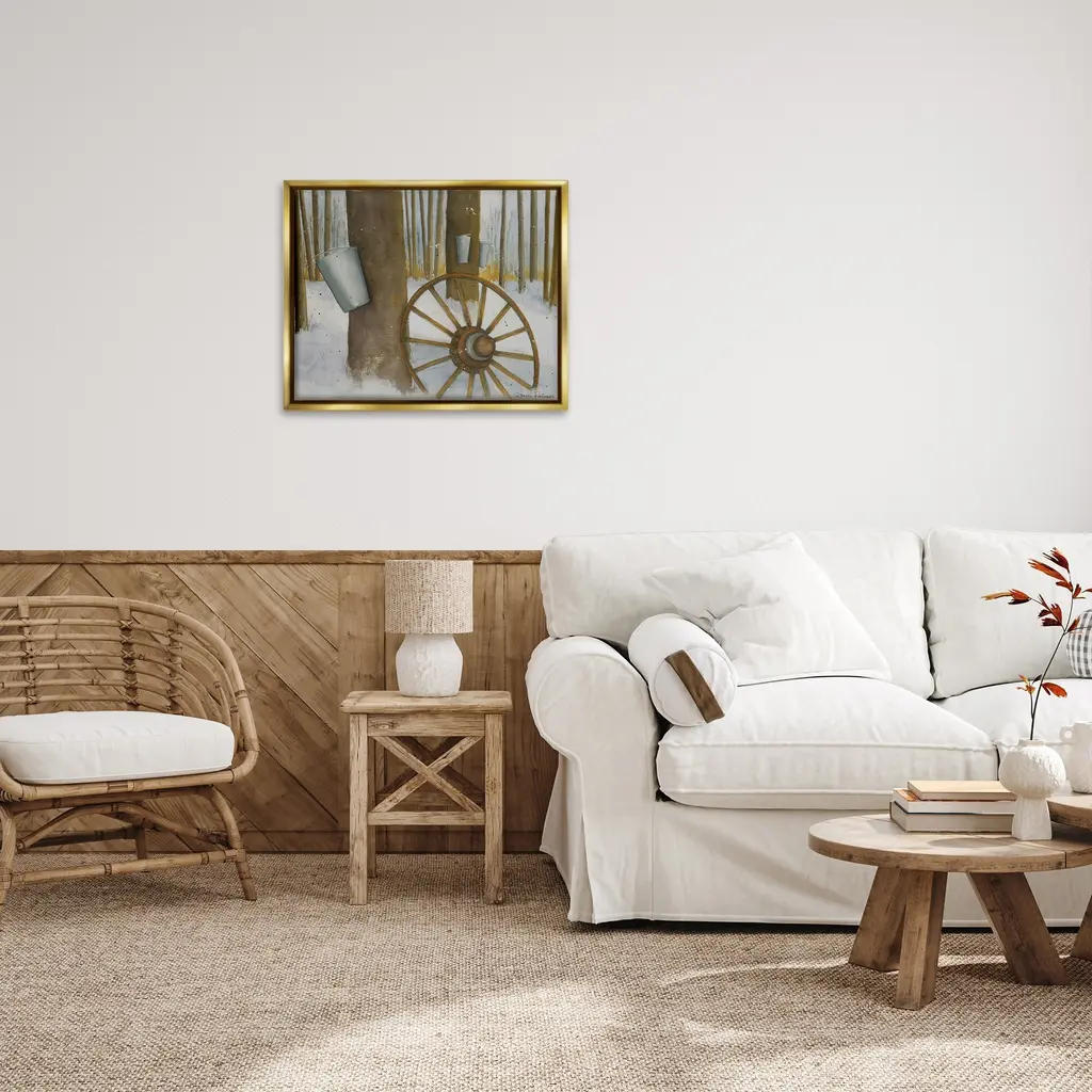 Elevate your home or office to the next level with Stupell Framed Floating Canvas Wall Art. Our premium hand-stretched canvas is mounted securely into a sturdy lightweight frame. The museum-style gap between the wrapped canvas and the box frame gives the illusion of floating artwork. Stupell Wall Art is made in the USA.Features: Dimensions: 21 x 1.7 x 17 Frame, 20 x 1.5 x 16 Canvas ArtFloating Frame Canvas Products are available in sizes 21"x17" and 31"x25". All Floating Frame Canvas Products have a 1.7" Depth.Wall Art is Ready to Hang with Hardware Free Hanging. No Installation required. For Easy Set Up Lean or Layer Artwork on Shelf or Against Wall. Artwork is Permently Fixed into the Frame.Our elevated 1.7" Thick Floating Frame is the perfect complement to our canvas style Wall Art. We use only the highest quality inks in house with industry leading printing solutions. Canvas is hand stretched over a durable wood foundation and then mounted securly into a Modern Box Frame. Made in the USA.Artwork Relates To: Wheel, Spoke, Nature, Woodland, Country, Snow, Winter, Rustic, Maple SyrupDesign by Gloria Palmer