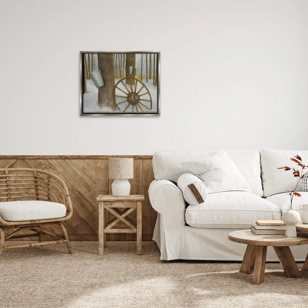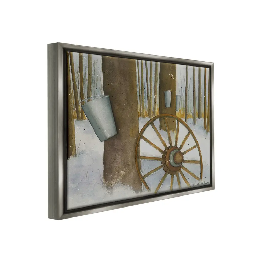 Elevate your home or office to the next level with Stupell Framed Floating Canvas Wall Art. Our premium hand-stretched canvas is mounted securely into a sturdy lightweight frame. The museum-style gap between the wrapped canvas and the box frame gives the illusion of floating artwork. Stupell Wall Art is made in the USA.Features: Dimensions: 21 x 1.7 x 17 Frame, 20 x 1.5 x 16 Canvas ArtFloating Frame Canvas Products are available in sizes 21"x17" and 31"x25". All Floating Frame Canvas Products have a 1.7" Depth.Wall Art is Ready to Hang with Hardware Free Hanging. No Installation required. For Easy Set Up Lean or Layer Artwork on Shelf or Against Wall. Artwork is Permently Fixed into the Frame.Our elevated 1.7" Thick Floating Frame is the perfect complement to our canvas style Wall Art. We use only the highest quality inks in house with industry leading printing solutions. Canvas is hand stretched over a durable wood foundation and then mounted securly into a Modern Box Frame. Made in the USA.Artwork Relates To: Wheel, Spoke, Nature, Woodland, Country, Snow, Winter, Rustic, Maple SyrupDesign by Gloria Palmer
