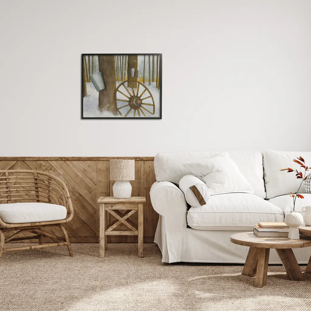 Add dimension to any room with our textured Framed Giclee Artwork. Our framed artwork is securely mounted into a 1.5-inch thick wood grain frame and ready to hang. Frames are available in three alluring styles: black, gray farmhouse and white. In addition, you should check out our oversized options if you want a statement piece. Stupell Wall Art is made in the USA.Features: Dimensions: 14 x 1.5 x 11 FramedFramed Giclee Products are available in the sizes 14"x11", 20"x16" or 30"x24". All Framed Giclee Products have a 1.5" Depth. Wall Art is Ready to Hang with Hardware Free Hanging. No installation required. For Easy Set Up Lean or Layer Artwork on Shelf or Against Wall.Our giclée prints are carefully mounted on a durable MDF backing, and then perfectly finished in a 1.5 inch thick woodgrain frame. Mounted frame colors include black, gray farmhouse and white. Made In USA.Artwork Relates To: Wheel, Spoke, Nature, Woodland, Country, Snow, Winter, Rustic, Maple SyrupDesign by Gloria Palmer