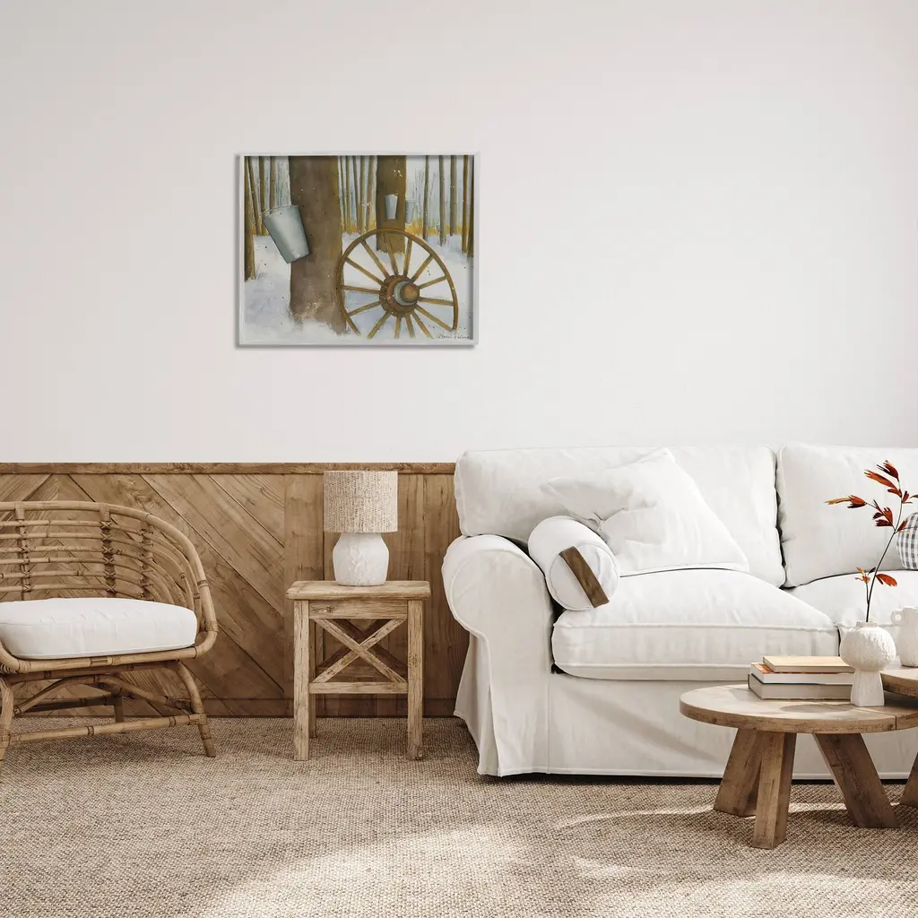 Add dimension to any room with our textured Framed Giclee Artwork. Our framed artwork is securely mounted into a 1.5-inch thick wood grain frame and ready to hang. Frames are available in three alluring styles: black, gray farmhouse and white. In addition, you should check out our oversized options if you want a statement piece. Stupell Wall Art is made in the USA.Features: Dimensions: 14 x 1.5 x 11 FramedFramed Giclee Products are available in the sizes 14"x11", 20"x16" or 30"x24". All Framed Giclee Products have a 1.5" Depth. Wall Art is Ready to Hang with Hardware Free Hanging. No installation required. For Easy Set Up Lean or Layer Artwork on Shelf or Against Wall.Our giclée prints are carefully mounted on a durable MDF backing, and then perfectly finished in a 1.5 inch thick woodgrain frame. Mounted frame colors include black, gray farmhouse and white. Made In USA.Artwork Relates To: Wheel, Spoke, Nature, Woodland, Country, Snow, Winter, Rustic, Maple SyrupDesign by Gloria Palmer