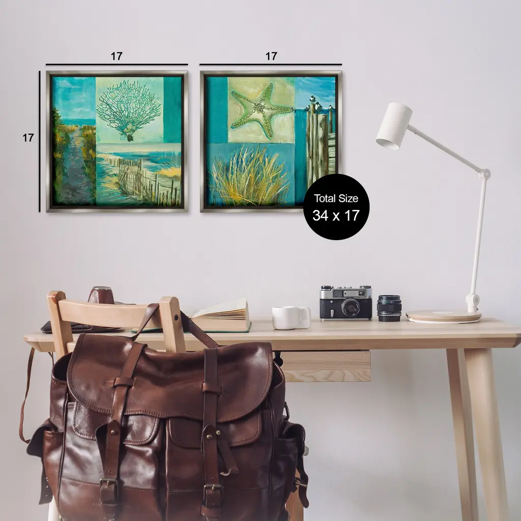 Elevate your home or office to the next level with Stupell Framed Floating Canvas Wall Art. Our premium hand-stretched canvas is mounted securely into a sturdy lightweight frame. The museum-style gap between the wrapped canvas and the box frame gives the illusion of floating artwork. Stupell Wall Art is made in the USA.Features: Dimensions: 2 Piece Set, Each Frame is 18 x 1.7 x 18Two Piece Floating Frame Canvas Products are available as 18"x18" or 25"x25" Panels. All Floating Frame Canvas Products have a 1.7" Depth.Wall Art is Ready to Hang with Hardware Free Hanging. No Installation required. For Easy Set Up Lean or Layer Artwork on Shelf or Against Wall. Artwork is Permently Fixed into the Frame.Our elevated 1.7" Thick Floating Frame is the perfect complement to our canvas style Wall Art. We use only the highest quality inks in house with industry leading printing solutions. Canvas is hand stretched over a durable wood foundation and then mounted securly into a Modern Box Frame. Made in the USA.Artwork Relates To: Fence, Water, Nature, Plant, Modern, Beach, Nautical, Summer, Collage, Coral, Sea Life, StarfishDesign by Liz Jardine