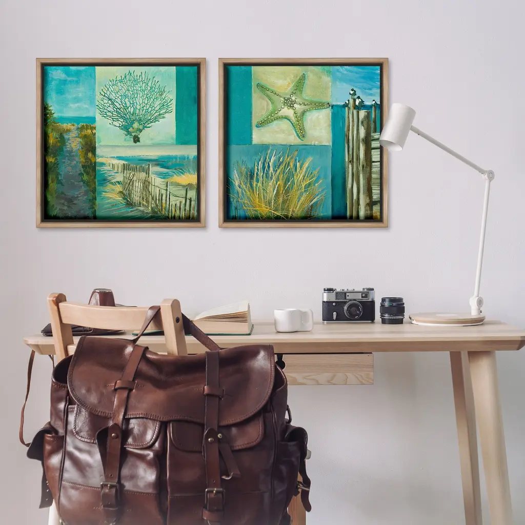 Elevate your home or office to the next level with Stupell Framed Floating Canvas Wall Art. Our premium hand-stretched canvas is mounted securely into a sturdy lightweight frame. The museum-style gap between the wrapped canvas and the box frame gives the illusion of floating artwork. Stupell Wall Art is made in the USA.Features: Dimensions: 2 Piece Set, Each Frame is 18 x 1.7 x 18Two Piece Floating Frame Canvas Products are available as 18"x18" or 25"x25" Panels. All Floating Frame Canvas Products have a 1.7" Depth.Wall Art is Ready to Hang with Hardware Free Hanging. No Installation required. For Easy Set Up Lean or Layer Artwork on Shelf or Against Wall. Artwork is Permently Fixed into the Frame.Our elevated 1.7" Thick Floating Frame is the perfect complement to our canvas style Wall Art. We use only the highest quality inks in house with industry leading printing solutions. Canvas is hand stretched over a durable wood foundation and then mounted securly into a Modern Box Frame. Made in the USA.Artwork Relates To: Fence, Water, Nature, Plant, Modern, Beach, Nautical, Summer, Collage, Coral, Sea Life, StarfishDesign by Liz Jardine