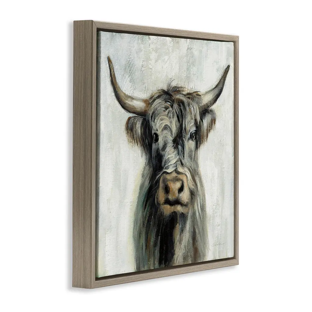 Elevate your home or office to the next level with Stupell Framed Floating Canvas Wall Art. Our premium hand-stretched canvas is mounted securely into a sturdy lightweight frame. The museum-style gap between the wrapped canvas and the box frame gives the illusion of floating artwork. Stupell Wall Art is made in the USA.Features: Dimensions: 18 x 1.7 x 18 Frame, 17 x 1.5 x 17 Canvas ArtFloating Frame Canvas Products are available in sizes 18"x18" and 25"x25". All Floating Frame Canvas Products have a 1.7" Depth.Wall Art is Ready to Hang with Hardware Free Hanging. No Installation required. For Easy Set Up Lean or Layer Artwork on Shelf or Against Wall. Artwork is Permently Fixed into the Frame.Our elevated 1.7" Thick Floating Frame is the perfect complement to our canvas style Wall Art. We use only the highest quality inks in house with industry leading printing solutions. Canvas is hand stretched over a durable wood foundation and then mounted securly into a Modern Box Frame. Made in the USA.Artwork Relates To: Animal, Rustic, Farmhouse, Cow, Cattle, PortraitDesign by Silvia Vassileva