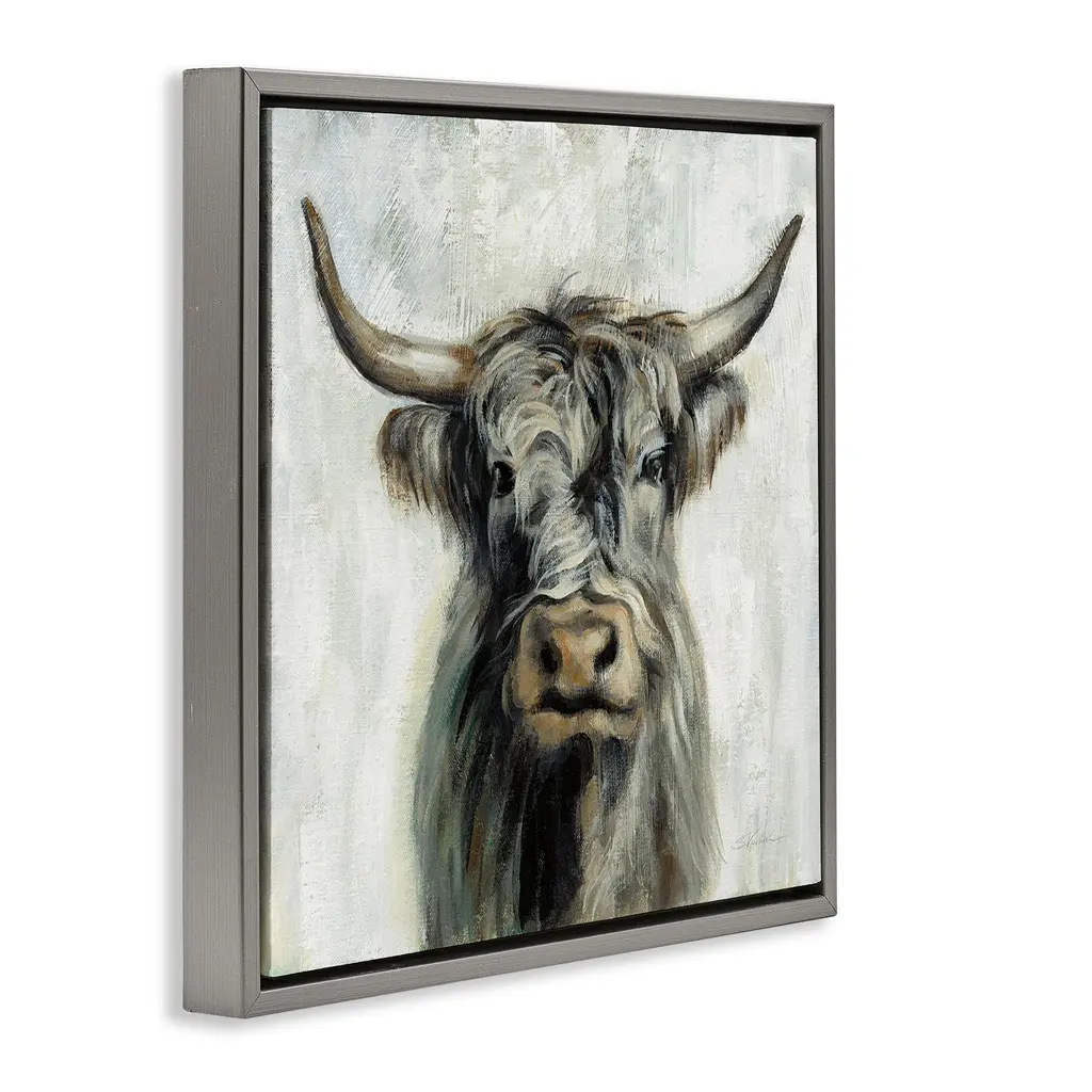 Elevate your home or office to the next level with Stupell Framed Floating Canvas Wall Art. Our premium hand-stretched canvas is mounted securely into a sturdy lightweight frame. The museum-style gap between the wrapped canvas and the box frame gives the illusion of floating artwork. Stupell Wall Art is made in the USA.Features: Dimensions: 18 x 1.7 x 18 Frame, 17 x 1.5 x 17 Canvas ArtFloating Frame Canvas Products are available in sizes 18"x18" and 25"x25". All Floating Frame Canvas Products have a 1.7" Depth.Wall Art is Ready to Hang with Hardware Free Hanging. No Installation required. For Easy Set Up Lean or Layer Artwork on Shelf or Against Wall. Artwork is Permently Fixed into the Frame.Our elevated 1.7" Thick Floating Frame is the perfect complement to our canvas style Wall Art. We use only the highest quality inks in house with industry leading printing solutions. Canvas is hand stretched over a durable wood foundation and then mounted securly into a Modern Box Frame. Made in the USA.Artwork Relates To: Animal, Rustic, Farmhouse, Cow, Cattle, PortraitDesign by Silvia Vassileva