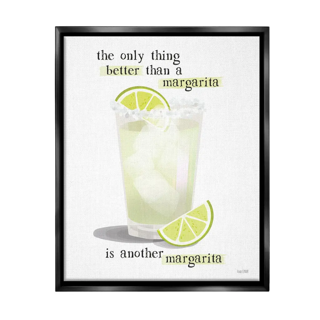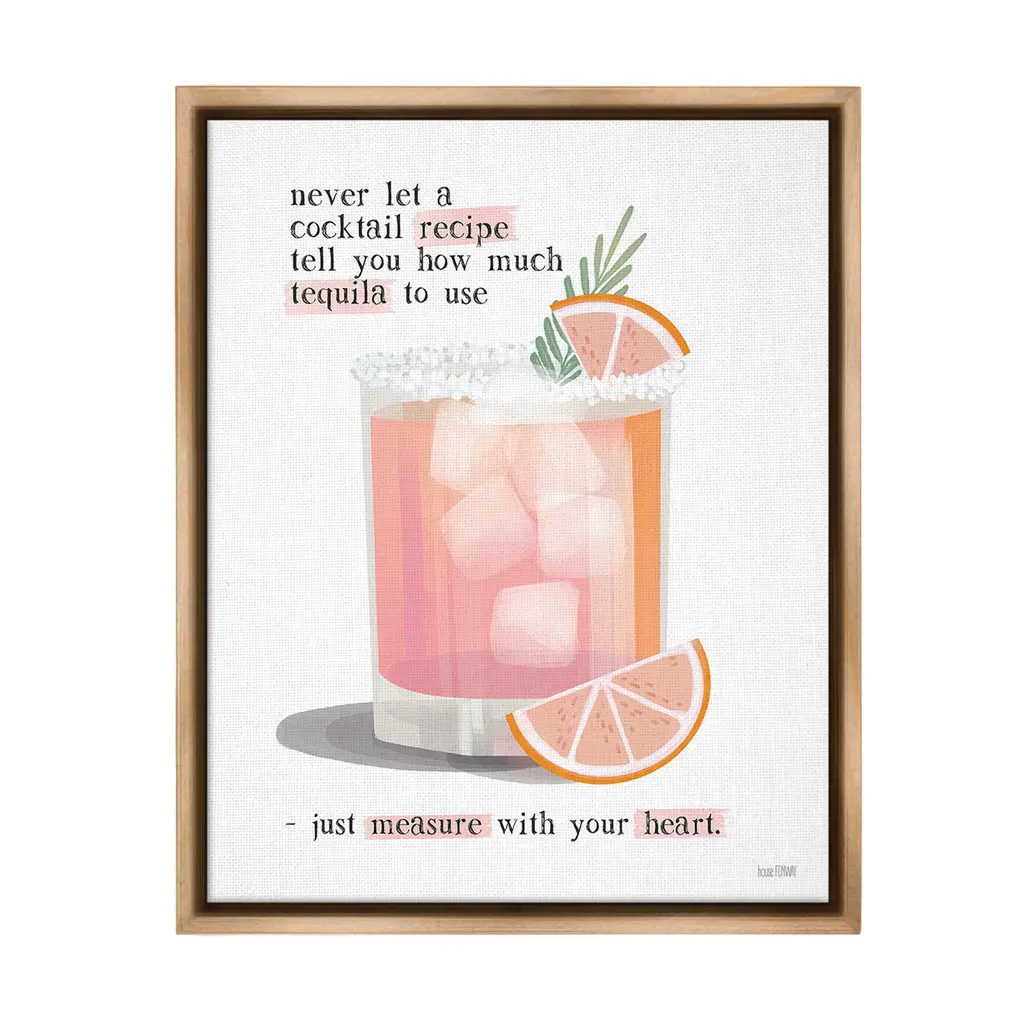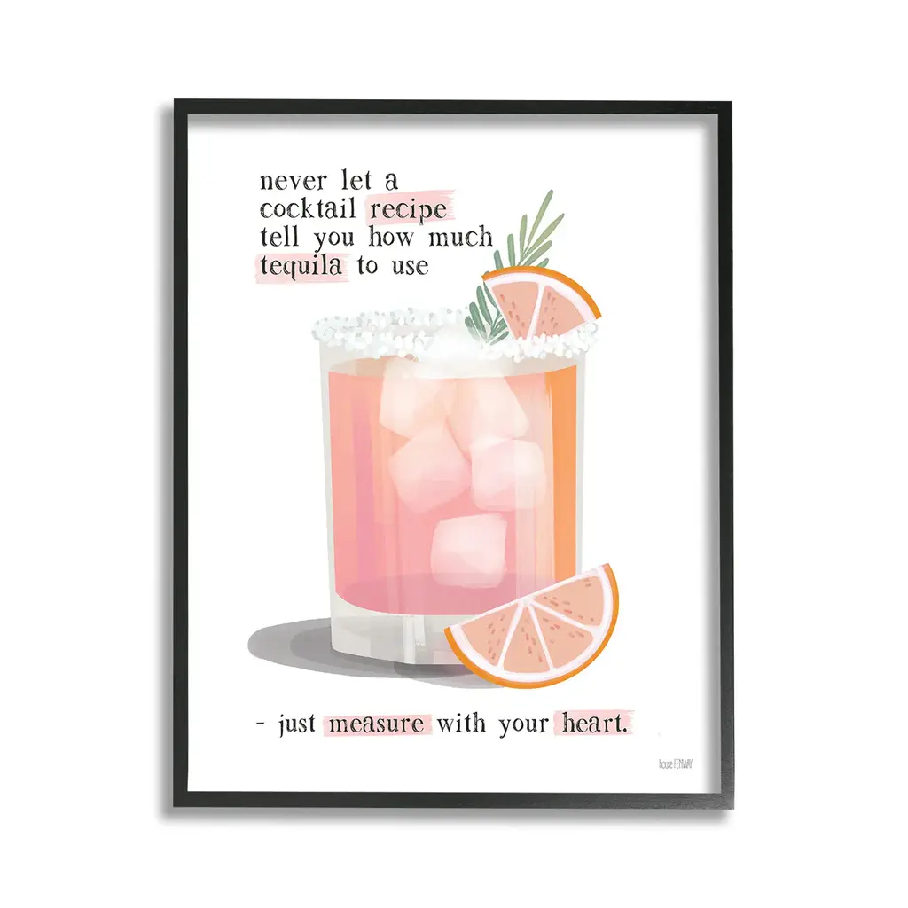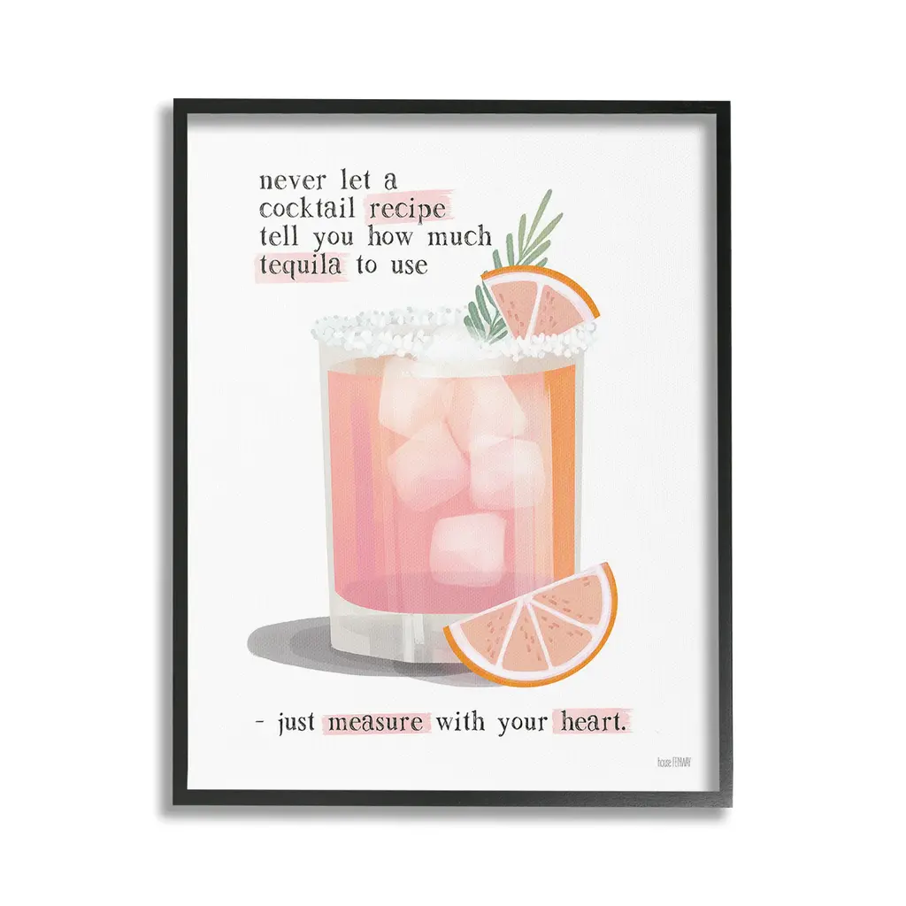 Elevate your home or office to the next level with Stupell Framed Floating Canvas Wall Art. Our premium hand-stretched canvas is mounted securely into a sturdy lightweight frame. The museum-style gap between the wrapped canvas and the box frame gives the illusion of floating artwork. Stupell Wall Art is made in the USA.Features: Dimensions: 17 x 1.7 x 21 Frame, 16 x 1.5 x 20 Canvas ArtFloating Frame Canvas Products are available in sizes 17"x21" and 25"x31". All Floating Frame Canvas Products have a 1.7" Depth.Wall Art is Ready to Hang with Hardware Free Hanging. No Installation required. For Easy Set Up Lean or Layer Artwork on Shelf or Against Wall. Artwork is Permently Fixed into the Frame.Our elevated 1.7" Thick Floating Frame is the perfect complement to our canvas style Wall Art. We use only the highest quality inks in house with industry leading printing solutions. Canvas is hand stretched over a durable wood foundation and then mounted securly into a Modern Box Frame. Made in the USA.Artwork Relates To: Beverage, Bar, Citrus, Fruit, Grapefruit, Alcohol, Cocktail, Mojito, Margarita, Never Let a Cocktail Recipe Tell You How Much Tequila to Use - Just Measure with Your HeartDesign by House Fenway