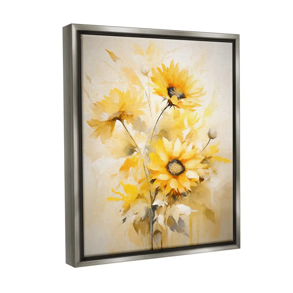 Elevate your home or office to the next level with Stupell Framed Floating Canvas Wall Art. Our premium hand-stretched canvas is mounted securely into a sturdy lightweight frame. The museum-style gap between the wrapped canvas and the box frame gives the illusion of floating artwork. Stupell Wall Art is made in the USA.Features: Dimensions: 17 x 1.7 x 21 Frame, 16 x 1.5 x 20 Canvas ArtFloating Frame Canvas Products are available in sizes 17"x21" and 25"x31". All Floating Frame Canvas Products have a 1.7" Depth.Wall Art is Ready to Hang with Hardware Free Hanging. No Installation required. For Easy Set Up Lean or Layer Artwork on Shelf or Against Wall. Artwork is Permently Fixed into the Frame.Our elevated 1.7" Thick Floating Frame is the perfect complement to our canvas style Wall Art. We use only the highest quality inks in house with industry leading printing solutions. Canvas is hand stretched over a durable wood foundation and then mounted securly into a Modern Box Frame. Made in the USA.Artwork Relates To: Flower, Plant, Daisy, Sunflower, Modern, Floral, Bouquet, Abstract, ModernDesign by Ramona Murdock