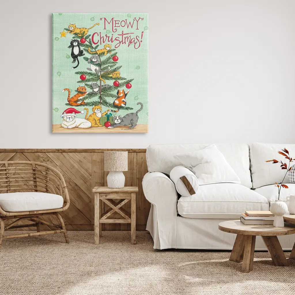 We create our stretched canvas to the highest standards. Using only the highest quality inks and canvas on Mimaki printers, we hand-cut and stretch each piece over a 1.5-inch thick wooden frame for hanging. As a result, the art comes ready to hang on the sturdy ledge with no installation required. Stupell Wall Art is made in the USA.Features: Dimensions: 16 x 1.5 x 20 InchesStretched Canvas Sizes Include Standard: 16 x 1.5 x 20 Large: 20 x 1.5 x 30 X-Large: 30 x 1.5 x 40 Oversized: 36 x 1.5 x 48Wall Art is Ready to Hang with Hardware Free Hanging. No installation required. For Easy Set Up Lean or Layer Artwork on Shelf or Against Wall.Our stretched canvas is created with the highest standards. We use only the highest quality inks and canvas on our in house Mimaki printers, and then hand cut and stretch each piece over a 1.5 inch thick wooden frame for hanging. Made In USA.Artwork Relates To: Cat, Christmas, Holiday, Christmas Tree, Pet, Meowy ChristmasDesign by Deb Strain
