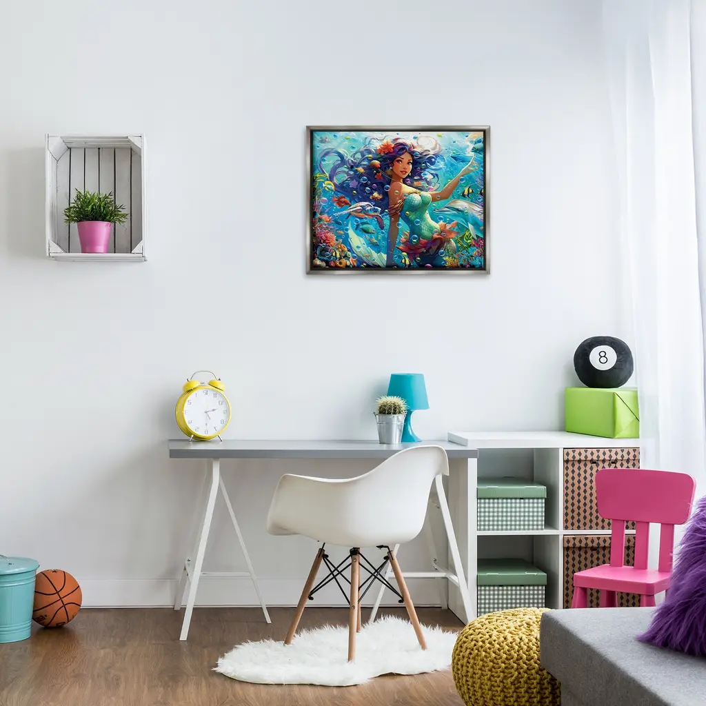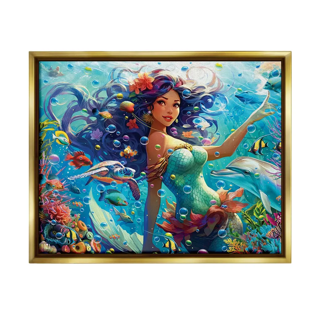 Elevate your home or office to the next level with Stupell Framed Floating Canvas Wall Art. Our premium hand-stretched canvas is mounted securely into a sturdy lightweight frame. The museum-style gap between the wrapped canvas and the box frame gives the illusion of floating artwork. Stupell Wall Art is made in the USA.Features: Dimensions: 21 x 1.7 x 17 Frame, 20 x 1.5 x 16 Canvas ArtFloating Frame Canvas Products are available in sizes 21"x17" and 31"x25". All Floating Frame Canvas Products have a 1.7" Depth.Wall Art is Ready to Hang with Hardware Free Hanging. No Installation required. For Easy Set Up Lean or Layer Artwork on Shelf or Against Wall. Artwork is Permently Fixed into the Frame.Our elevated 1.7" Thick Floating Frame is the perfect complement to our canvas style Wall Art. We use only the highest quality inks in house with industry leading printing solutions. Canvas is hand stretched over a durable wood foundation and then mounted securly into a Modern Box Frame. Made in the USA.Artwork Relates To: Sea, Water, Animal, Reef, Sea Life, Fish, Female, Person, Woman, Turtle, Aquatic, Mermaid, Fantasy, DolphinDesign by Michael David Ward