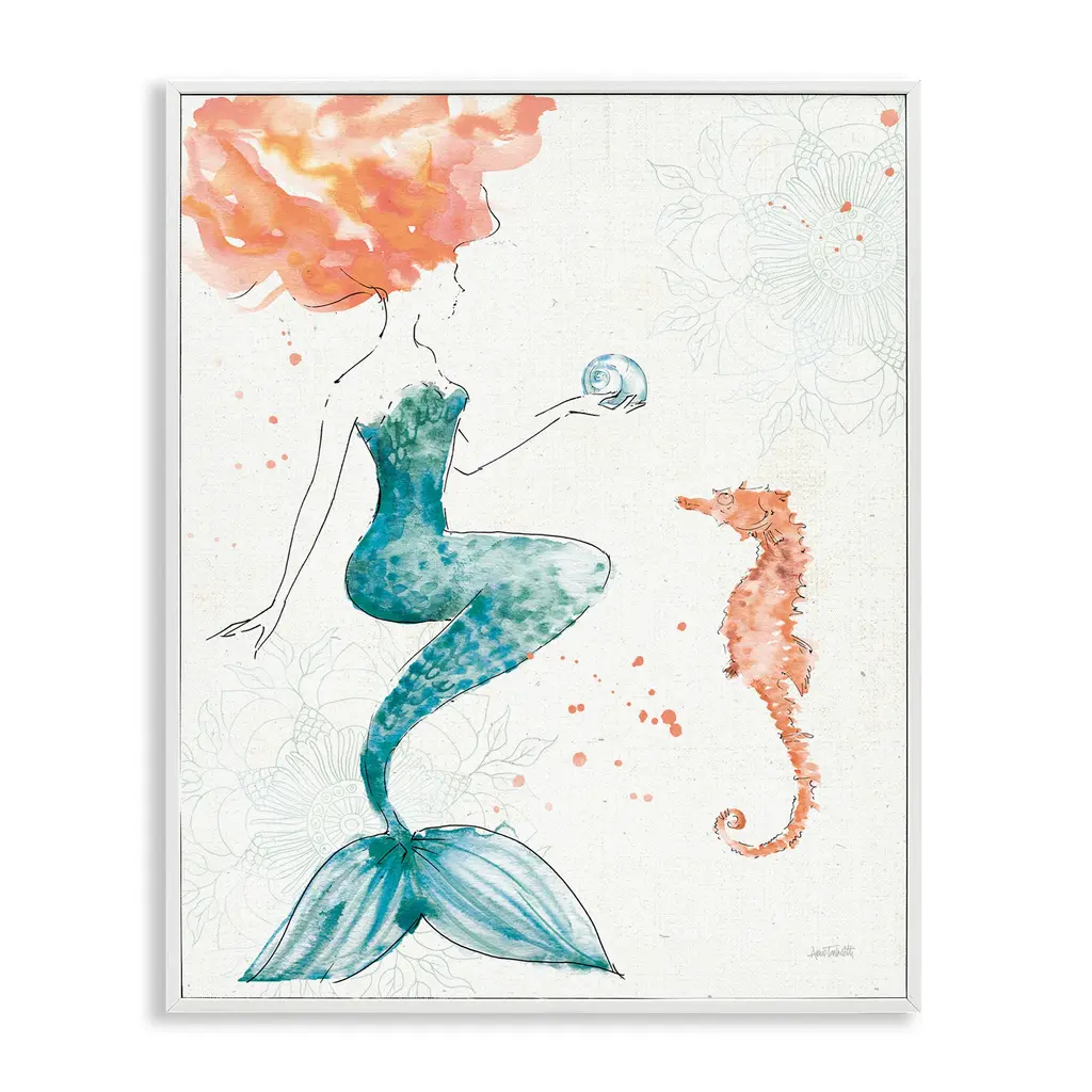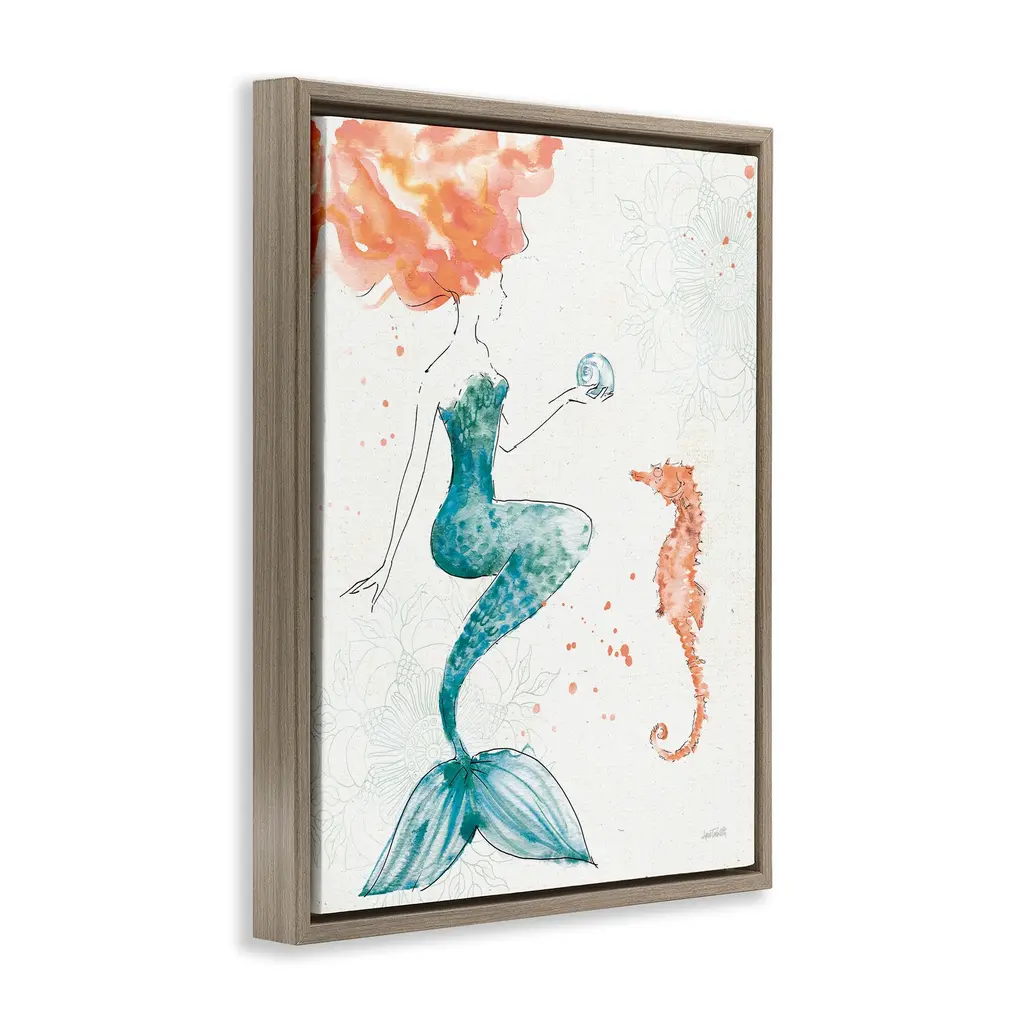 Elevate your home or office to the next level with Stupell Framed Floating Canvas Wall Art. Our premium hand stretched canvas is mounted securly into a sturdy lightweight frame. The museum style gap between wrapped canvas and box frame gives the illusion of floating artwork.Features:Floating Frame Sizes IncludeStandard: 21 x 1.7 x 17Oversized: 31 x 1.7 x 25Wall Art is Ready to Hang - No Installation or Hardware Needed. For Easy Set Up Lean or Layer Artwork on Shelf or Against Wall.Artwork Relates To: Animal, Sea Life, Seahorse, Painting, Mermaid, Pattern, Floral, SeashellOur elevated 1.7" Thick Floating Frame is the perfect complement to our canvas style Wall Art. We use only the highest quality inks in house with industry leading printing solutions. Canvas is hand stretched over a durable wood foundation and then mounted securly into a Modern Box Frame. Made in the USA.Design by Anne Tavoletti