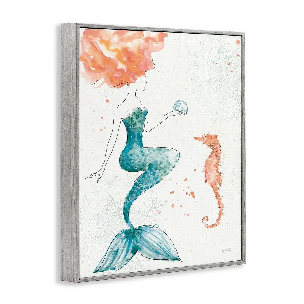 Stupell Mermaid And Ocean Seahorse Framed Giclee Texturized Wall Art, Design By Anne Tavoletti - 16 X 20 - Grey