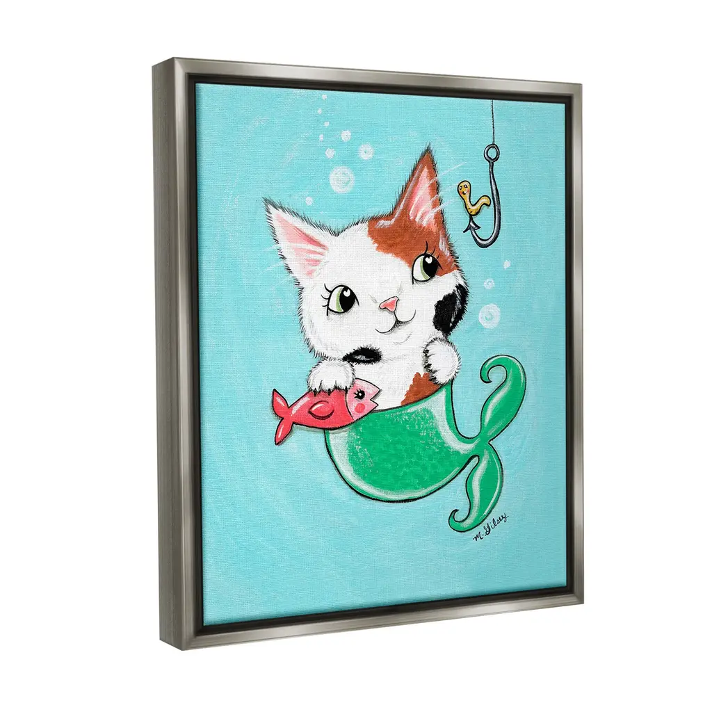 Elevate your home or office to the next level with Stupell Framed Floating Canvas Wall Art. Our premium hand-stretched canvas is mounted securely into a sturdy lightweight frame. The museum-style gap between the wrapped canvas and the box frame gives the illusion of floating artwork. Stupell Wall Art is made in the USA.Features: Dimensions: 17 x 1.7 x 21 Frame, 16 x 1.5 x 20 Canvas ArtFloating Frame Canvas Products are available in sizes 17"x21" and 25"x31". All Floating Frame Canvas Products have a 1.7" Depth.Wall Art is Ready to Hang with Hardware Free Hanging. No Installation required. For Easy Set Up Lean or Layer Artwork on Shelf or Against Wall. Artwork is Permently Fixed into the Frame.Our elevated 1.7" Thick Floating Frame is the perfect complement to our canvas style Wall Art. We use only the highest quality inks in house with industry leading printing solutions. Canvas is hand stretched over a durable wood foundation and then mounted securly into a Modern Box Frame. Made in the USA.Artwork Relates To: Animal, Cat, Mammal, Pet, Kitten, Fishing, Fish, Mermaid, Nautical, Beach, SwimmingDesign by Michelle Gilsey