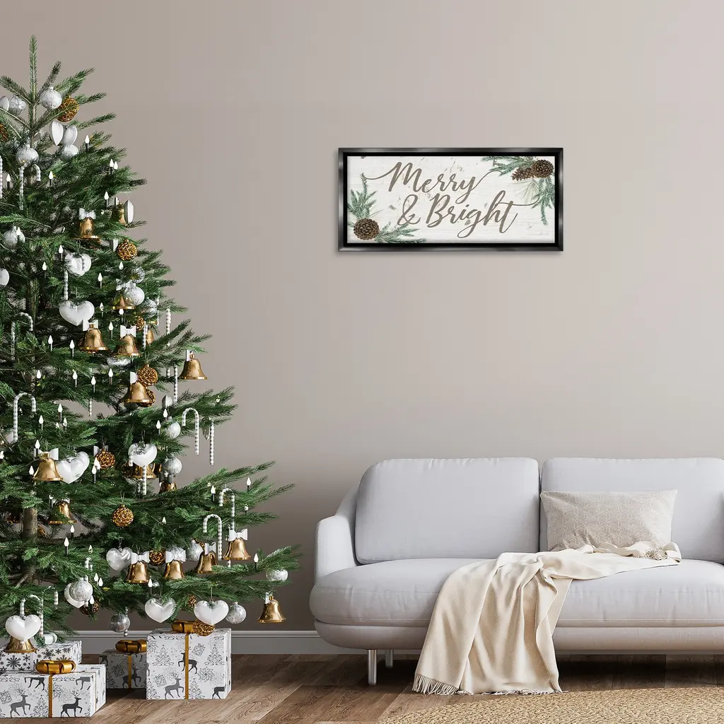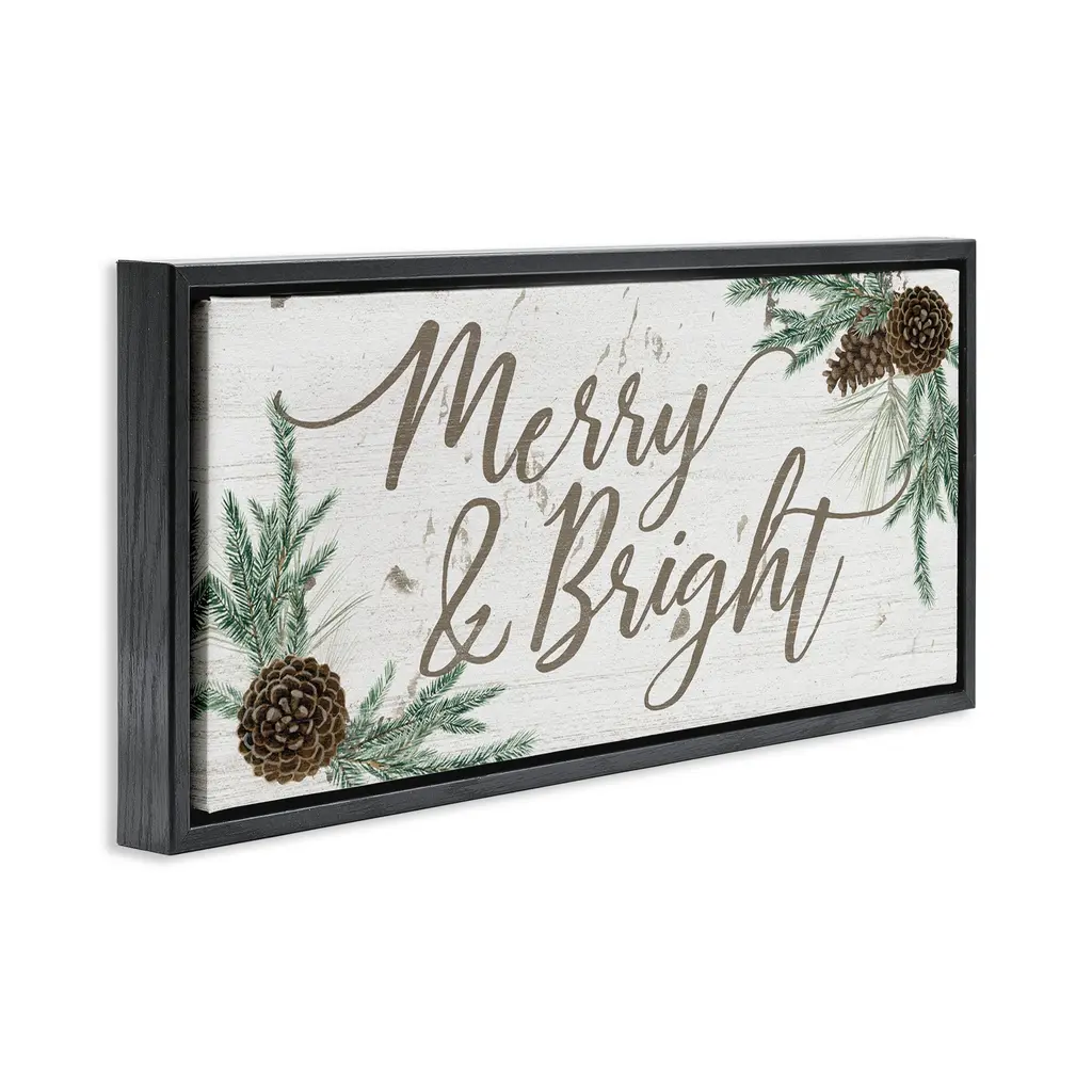 Elevate your home or office to the next level with Stupell Framed Floating Canvas Wall Art. Our premium hand-stretched canvas is mounted securely into a sturdy lightweight frame. The museum-style gap between the wrapped canvas and the box frame gives the illusion of floating artwork. Stupell Wall Art is made in the USA.Features: Dimensions: 25 x 1.7 x 11 Frame, 24 x 1.5 x 10 Canvas ArtFloating Frame Canvas Products are available in sizes 25"x11" and 31"x14". All Floating Frame Canvas Products have a 1.7" Depth.Wall Art is Ready to Hang with Hardware Free Hanging. No Installation required. For Easy Set Up Lean or Layer Artwork on Shelf or Against Wall. Artwork is Permently Fixed into the Frame.Our elevated 1.7" Thick Floating Frame is the perfect complement to our canvas style Wall Art. We use only the highest quality inks in house with industry leading printing solutions. Canvas is hand stretched over a durable wood foundation and then mounted securly into a Modern Box Frame. Made in the USA.Artwork Relates To: Holiday, Winter, Christmas, Seasonal, Merry, Pinecone, BotanicalDesign by Grace Popp