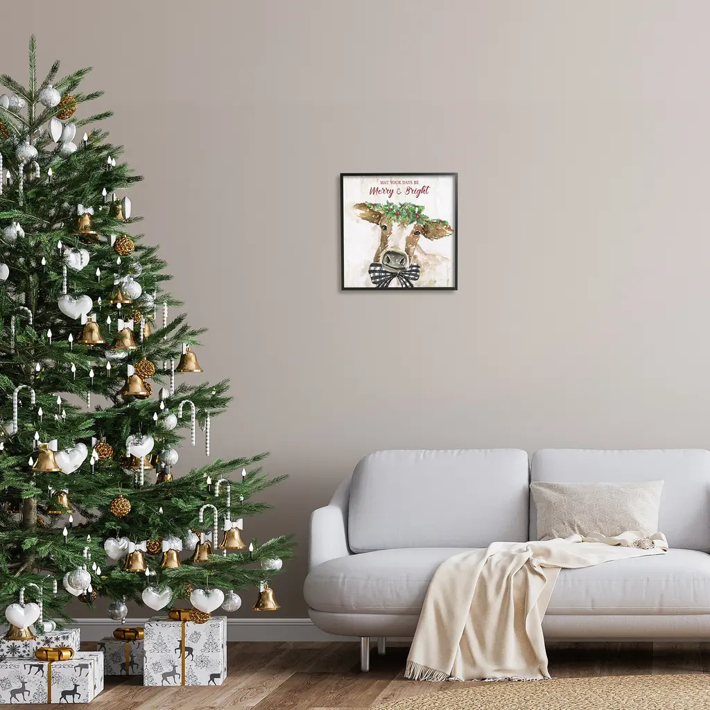 Add dimension to any room with our textured Framed Giclee Artwork. Our framed artwork is securely mounted into a 1.5-inch thick wood grain frame and ready to hang. Frames are available in three alluring styles: black, gray farmhouse and white. In addition, you should check out our oversized options if you want a statement piece. Stupell Wall Art is made in the USA.Features: Dimensions: 12 x 1.5 x 12 FramedFramed Giclee Sizes Include Standard: 12 x 1.5 x 12 Large: 17 x 1.5 x 17 Oversized: 24 x 1.5 x 24Wall Art is Ready to Hang - No Installation or Hardware Needed. For Easy Set Up Lean or Layer Artwork on Shelf or Against Wall.Our giclée prints are carefully mounted on a durable MDF backing, and then perfectly finished in a 1.5 inch thick woodgrain frame. Mounted frame colors include black, gray farmhouse and white. Made In USA.Artwork Relates To: Holiday, Seasonal, Christmas, Winter, Cattle, Farmhouse, May Your Days Be Merry & Bright, Holly BerryDesign by Nan
