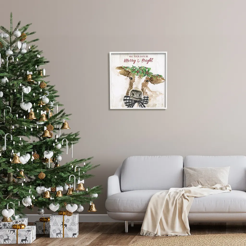 Add dimension to any room with our textured Framed Giclee Artwork. Our framed artwork is securely mounted into a 1.5-inch thick wood grain frame and ready to hang. Frames are available in three alluring styles: black, gray farmhouse and white. In addition, you should check out our oversized options if you want a statement piece. Stupell Wall Art is made in the USA.Features: Dimensions: 12 x 1.5 x 12 FramedFramed Giclee Sizes Include Standard: 12 x 1.5 x 12 Large: 17 x 1.5 x 17 Oversized: 24 x 1.5 x 24Wall Art is Ready to Hang - No Installation or Hardware Needed. For Easy Set Up Lean or Layer Artwork on Shelf or Against Wall.Our giclée prints are carefully mounted on a durable MDF backing, and then perfectly finished in a 1.5 inch thick woodgrain frame. Mounted frame colors include black, gray farmhouse and white. Made In USA.Artwork Relates To: Holiday, Seasonal, Christmas, Winter, Cattle, Farmhouse, May Your Days Be Merry & Bright, Holly BerryDesign by Nan