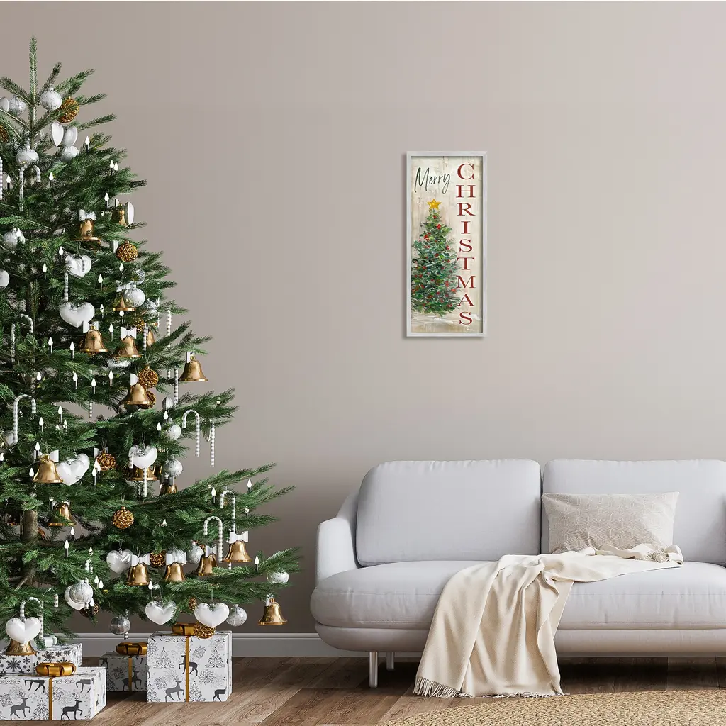 Stupell Merry Christmas Greeting Festive Rustic Holiday Tree Framed Wall Art - Green - 10 X 24 - Grey