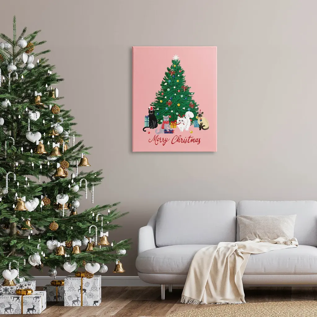 Proudly made in the USA, Our stretched canvas is created with the highest standards. We use only the highest quality inks and canvas on our in house Mimaki printers, and then hand cut and stretch each piece over a 1.5 inch thick wooden frame for hanging. The art comes ready to hang with no installation required.Features: Dimensions: 16 x 1.5 x 20 InchesStretched Canvas Sizes Include Standard: 16 x 1.5 x 20 Large: 20 x 1.5 x 30 X-Large: 30 x 1.5 x 40 Oversized: 36 x 1.5 x 48Wall Art is Ready to Hang - No Installation or Hardware Needed. For Easy Set Up Lean or Layer Artwork on Shelf or Against Wall.Our stretched canvas is created with the highest standards. We use only the highest quality inks and canvas on our in house Mimaki printers, and then hand cut and stretch each piece over a 1.5 inch thick wooden frame for hanging. Made In USA.Artwork Relates To: Festival, Christmas, Christmas Tree, Cat, Pet, Mammal, Animal, Holiday, GiftsDesign by Be Ni LaLiving Room, Den, Hallway, Office, Entryway, Study, Dining Room or Bed Room.Text Includes: Merry Christmas