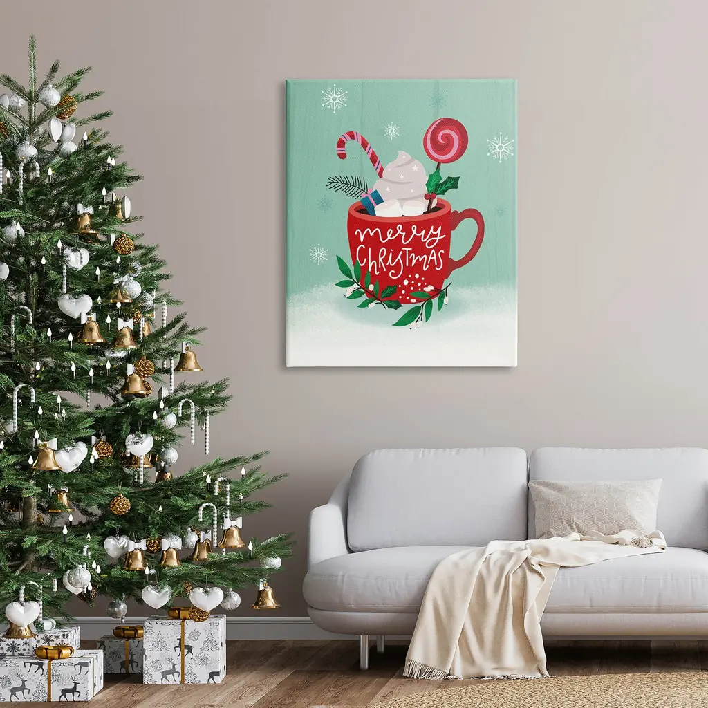 Proudly made in the USA, Our stretched canvas is created with the highest standards. We use only the highest quality inks and canvas on our in house Mimaki printers, and then hand cut and stretch each piece over a 1.5 inch thick wooden frame for hanging. The art comes ready to hang with no installation required.Features: Dimensions: 16 x 1.5 x 20 InchesStretched Canvas Sizes Include Standard: 16 x 1.5 x 20 Large: 20 x 1.5 x 30 X-Large: 30 x 1.5 x 40 Oversized: 36 x 1.5 x 48Wall Art is Ready to Hang - No Installation or Hardware Needed. For Easy Set Up Lean or Layer Artwork on Shelf or Against Wall.Our stretched canvas is created with the highest standards. We use only the highest quality inks and canvas on our in house Mimaki printers, and then hand cut and stretch each piece over a 1.5 inch thick wooden frame for hanging. Made In USA.Artwork Relates To: Dessert, Sweets, Mug, Beverage, Cocoa, Christmas, Holiday, WinterDesign by Louise Allen DesignsLiving Room, Den, Hallway, Office, Entryway, Study, Dining Room or Bed Room.Text Includes: Merry Christmas