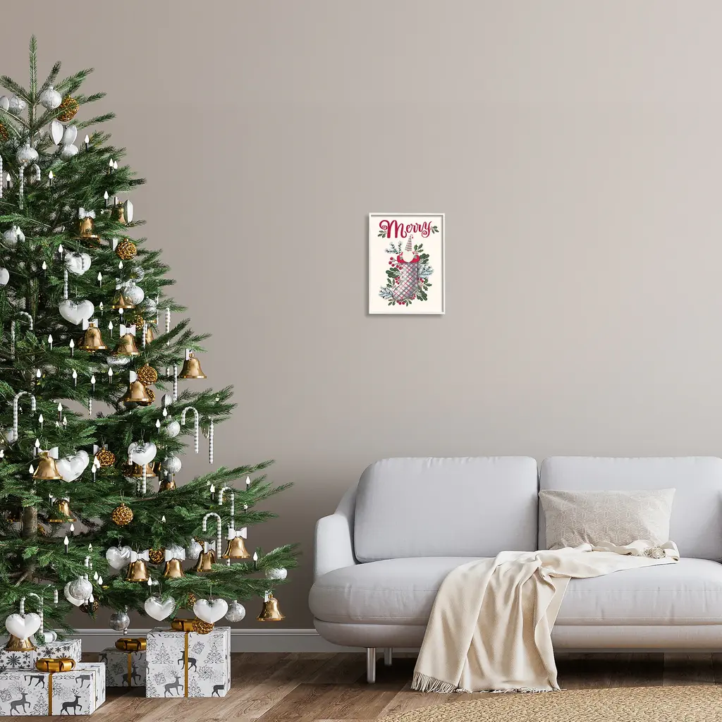Stupell Merry Sentiment Christmas Gnome In Plaid Holly Stocking Framed Wall Art - 11 X 14 - White