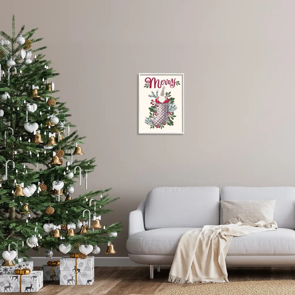 Stupell Merry Sentiment Christmas Gnome In Plaid Holly Stocking Framed Wall Art - 16 X 20 - White