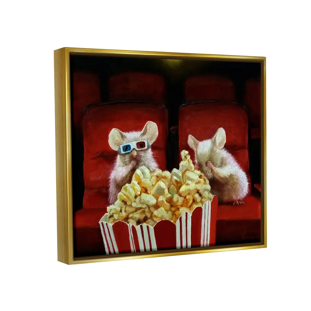 Elevate your home or office to the next level with Stupell Framed Floating Canvas Wall Art. Our premium hand-stretched canvas is mounted securely into a sturdy lightweight frame. The museum-style gap between the wrapped canvas and the box frame gives the illusion of floating artwork. Stupell Wall Art is made in the USA.Features: Dimensions: 21 x 1.7 x 17 Frame, 20 x 1.5 x 16 Canvas ArtFloating Frame Sizes Include Standard: 21 x 1.7 x 17 Oversized: 31 x 1.7 x 25Wall Art is Ready to Hang - No Installation or Hardware Needed. For Easy Set Up Lean or Layer Artwork on Shelf or Against Wall.Our elevated 1.7" Thick Floating Frame is the perfect complement to our canvas style Wall Art. We use only the highest quality inks in house with industry leading printing solutions. Canvas is hand stretched over a durable wood foundation and then mounted securly into a Modern Box Frame. Made in the USA.Artwork Relates To: Food, Snack, Animal, Mammal, Mouse, Rodent, Popcorn, Movie Theater Design by Lucia Heffernan