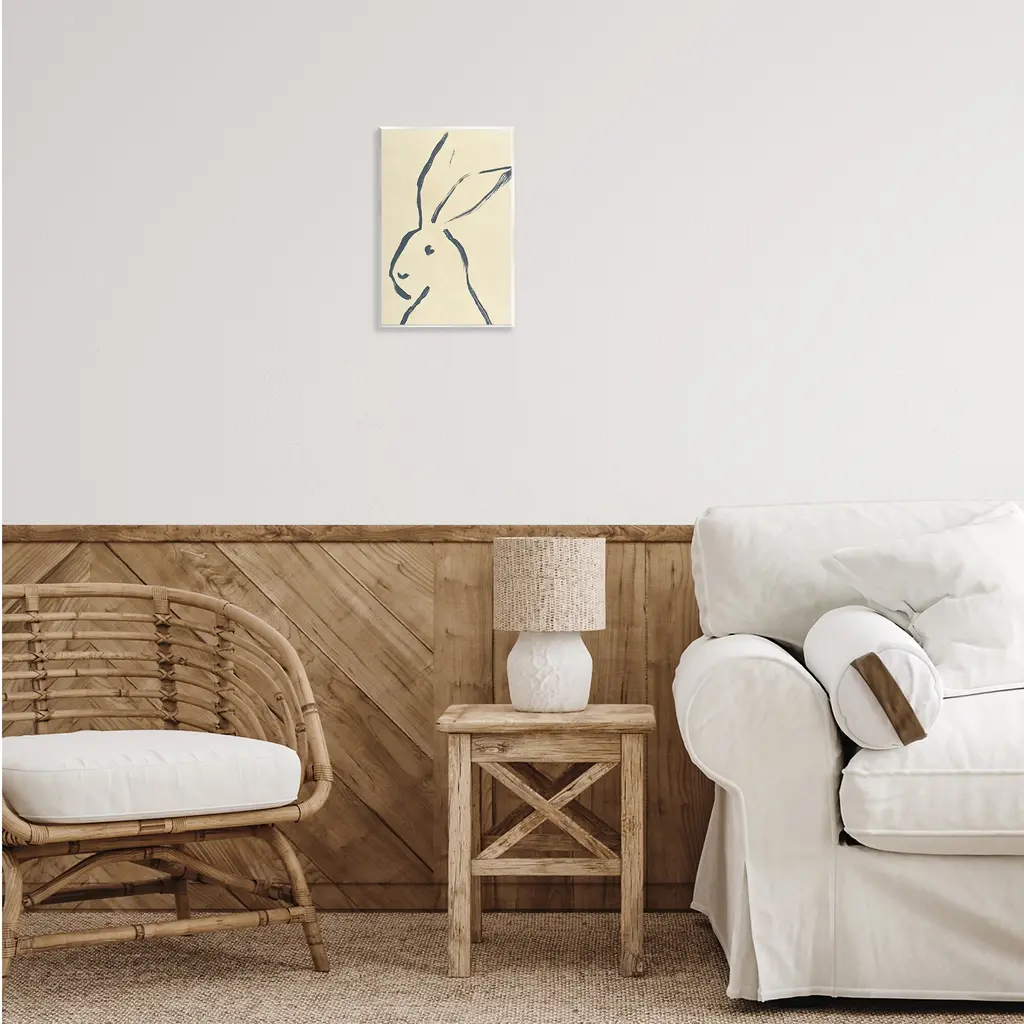 Our wall plaques start as high-quality lithograph prints mounted on durable 0.5-inch thick MDF wood. Each piece is hand finished and comes with a fresh layer of white foil on the sides to give it a crisp, clean look. Plaques arrive ready to hang without installation and come with removable plastic corners to keep them from damage in transit. Stupell Wall Art is made in the USA.Features: Dimensions: 10 x 0.5 x 15 InchesWall Plaque Product Sizes Include 10"x15" and 13"x19". All wall plaque products have a 0.5" Depth. Wall Art is Ready to Hang with Hardware Free Hanging. No installation required. For Easy Set Up Lean or Layer Artwork on Shelf or Against Wall.All of our wall plaques start off as high quality lithograph prints that are then mounted on durable 0.5 inch thick MDF wood. Each piece is hand finished and comes with a fresh layer of foil on the sides to give it a crisp clean look. Made In USA.Artwork Relates To: Animal, Hare, Mammal, Wildlife, Rabbit, Bunny, MinimalDesign by June Erica Vess