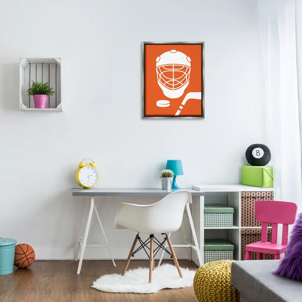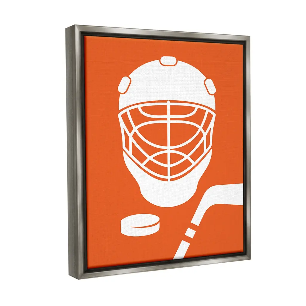 Elevate your home or office to the next level with Stupell Framed Floating Canvas Wall Art. Our premium hand-stretched canvas is mounted securely into a sturdy lightweight frame. The museum-style gap between the wrapped canvas and the box frame gives the illusion of floating artwork. Stupell Wall Art is made in the USA.Features: Dimensions: 17 x 1.7 x 21 Frame, 16 x 1.5 x 20 Canvas ArtFloating Frame Canvas Products are available in sizes 17"x21" and 25"x31". All Floating Frame Canvas Products have a 1.7" Depth.Wall Art is Ready to Hang with Hardware Free Hanging. No Installation required. For Easy Set Up Lean or Layer Artwork on Shelf or Against Wall. Artwork is Permently Fixed into the Frame.Our elevated 1.7" Thick Floating Frame is the perfect complement to our canvas style Wall Art. We use only the highest quality inks in house with industry leading printing solutions. Canvas is hand stretched over a durable wood foundation and then mounted securly into a Modern Box Frame. Made in the USA.Artwork Relates To: Helmet, Sport, Hockey, Ice Hockey, Puck, Hockey Stick, MinimalDesign by Melody Hogan