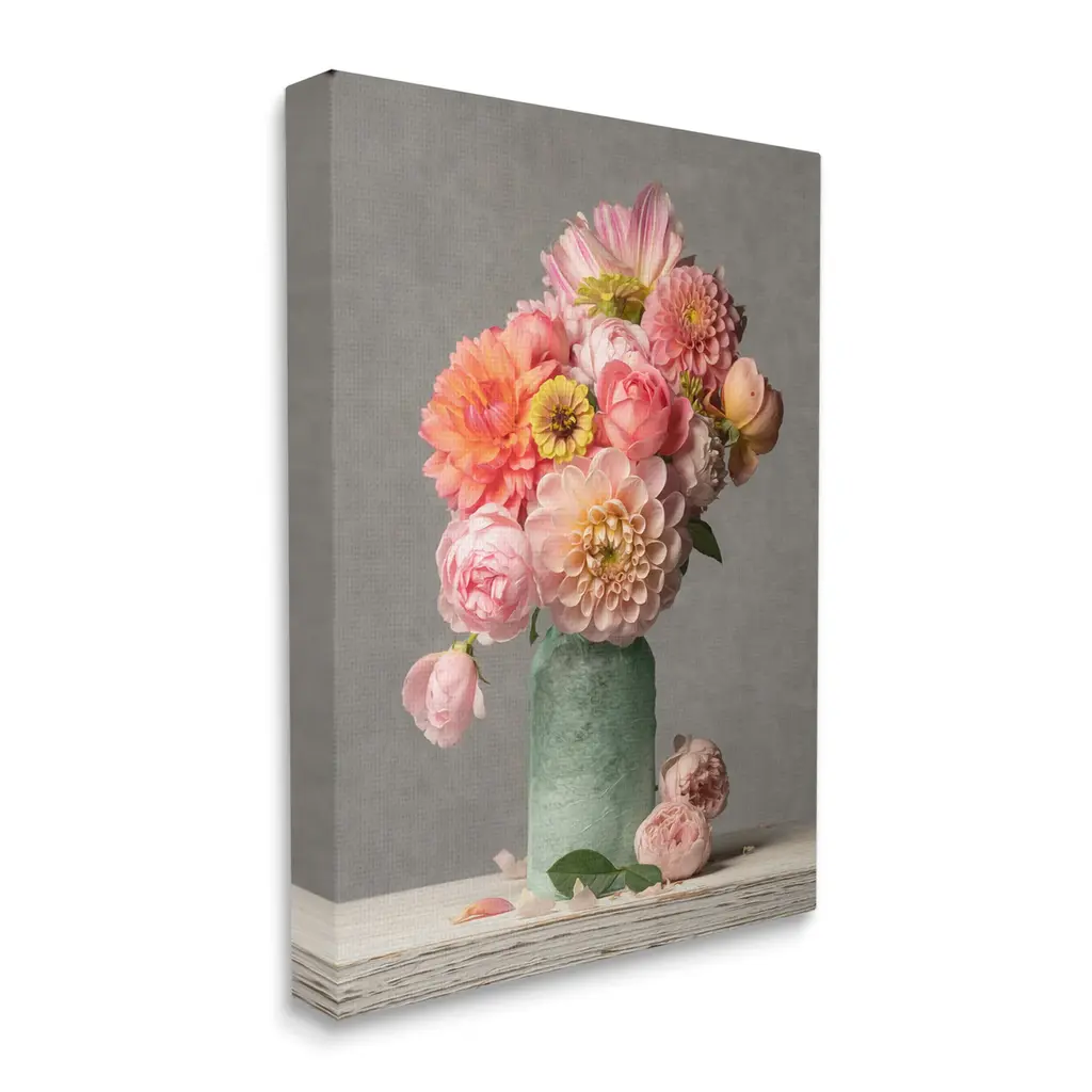 We create our stretched canvas to the highest standards. Using only the highest quality inks and canvas on Mimaki printers, we hand-cut and stretch each piece over a 1.5-inch thick wooden frame for hanging. As a result, the art comes ready to hang on the sturdy ledge with no installation required. Stupell Wall Art is made in the USA.Features: Dimensions: 16 x 1.5 x 20 InchesStretched Canvas Sizes Include Standard: 16 x 1.5 x 20 Large: 20 x 1.5 x 30 X-Large: 30 x 1.5 x 40 Oversized: 36 x 1.5 x 48Wall Art is Ready to Hang - No Installation or Hardware Needed. For Easy Set Up Lean or Layer Artwork on Shelf or Against Wall.Our stretched canvas is created with the highest standards. We use only the highest quality inks and canvas on our in house Mimaki printers, and then hand cut and stretch each piece over a 1.5 inch thick wooden frame for hanging. Made In USA.Artwork Relates To: Flower, Flower Arrangement, Plant, Dahlia, Flower Bouquet, Petal, Rose, Floral, Ikebana, PeonyDesign by Leah McLean